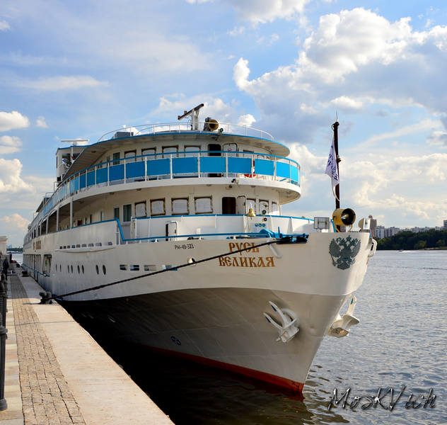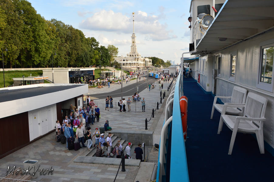 Начинаем мы на Северном Речном вокзале жарким субботним вечером 14 августа, где среди кушающей в забегаловках и просто праздно шатающейся публики (коих стало чересчур много после «обновления» СРВ), можно было разглядеть людей с чемоданами на колёсиках, стремившихся к теплоходу «Русь Великая», стоявшему у второго причала. По старой-доброй традиции охранники дождались часа «Х» и убедившись, что очередь собрана, начали потихоньку пропускать туристов на заветный теплоход.