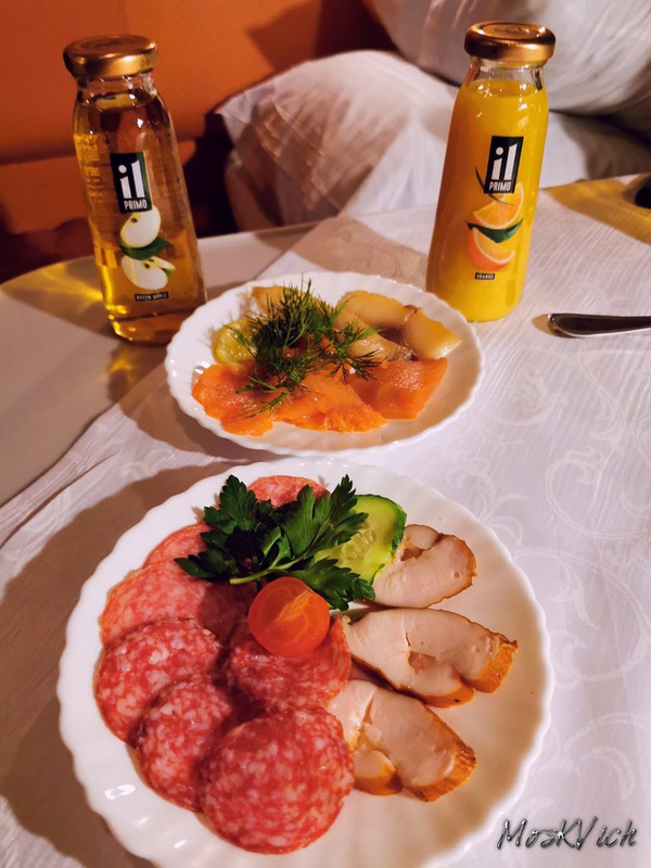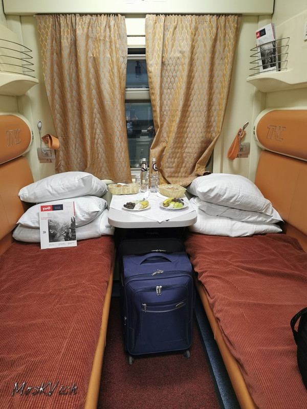 Купе. К ужину были предложены фрукты, мясная и рыбная закуска, а также горячее (тоже мясное или рыбное на выбор). Однако, в кадр попала только закуска, так как ожидая начала посадки мы немного проголодались, а когда был предложен ужин, то стало как-то не до фотоаппаратов.