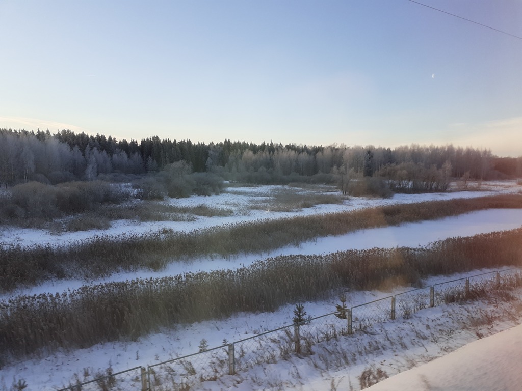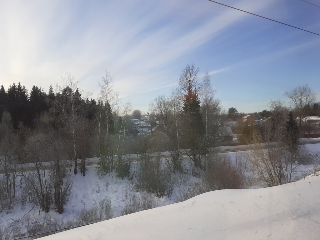 "Касная стрела" должна была прибыть в Москву в 07.55. Фактически мы будем там не ранее полудня. Ночью очень долго стояли. Проводник сказал, что из-за морозов произошёл обрыв контактного провода... В поезде часа три-три с половиной не работало яркое верхнее освещение и туалеты. Потом всё заработало - но не в нашем вагоне, а в соседних (куда и наносим визиты вежливости). Температура у нас в вагоне тоже понемногу падает: в 6 утра было +20 градусов, сейчас +16.