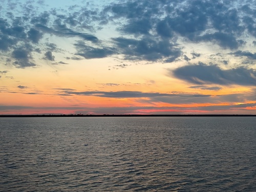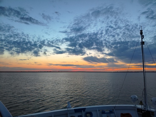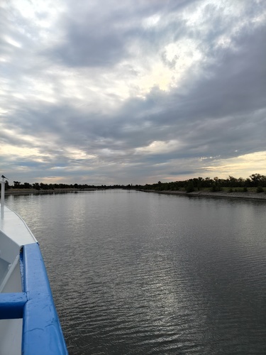 Насладившись закатом и шлюзом отправляемся на ужин. Мы уже опаздывали. Только приступив к трапезе, понимаем, что ход теплохода изменился, точно, шлюз же должен быть. Бегу на нос теплохода. 14 шлюз.