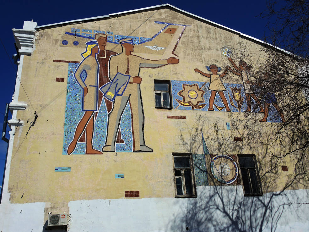 Панно на боковом фасаде дома Малышева (постройки конца XIX века) появилось в 1965 году. Оно называется "Гражданская авиация". Летом его частично закрывают разросшиеся деревья. Когда листьев на ветках нет, обзор лучше.