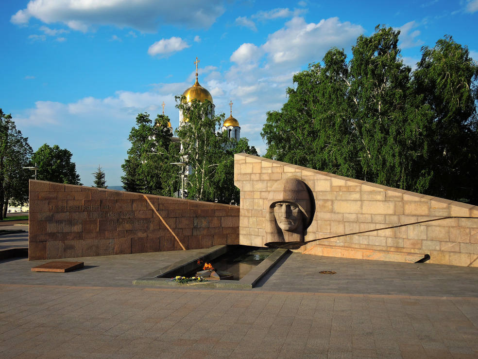 Центральная часть мемориала - Вечный огонь с монументом «Скорбящая мать». Был открыт вместе со всей площадью в 1971 году в память о 30-летии начала Великой Отечественной войны. Дополняют мемориал пять гранитных колонн, находящихся на подходе к нему. А справа (если стоять лицом) установлена Доска героев, где перечислены имена жителей Куйбышева, получивших звание Герой Советского Союза, полных кавалеров ордена Славы, а также жителей Самары, получивших звание Герой Российской Федерации уже в наше время.