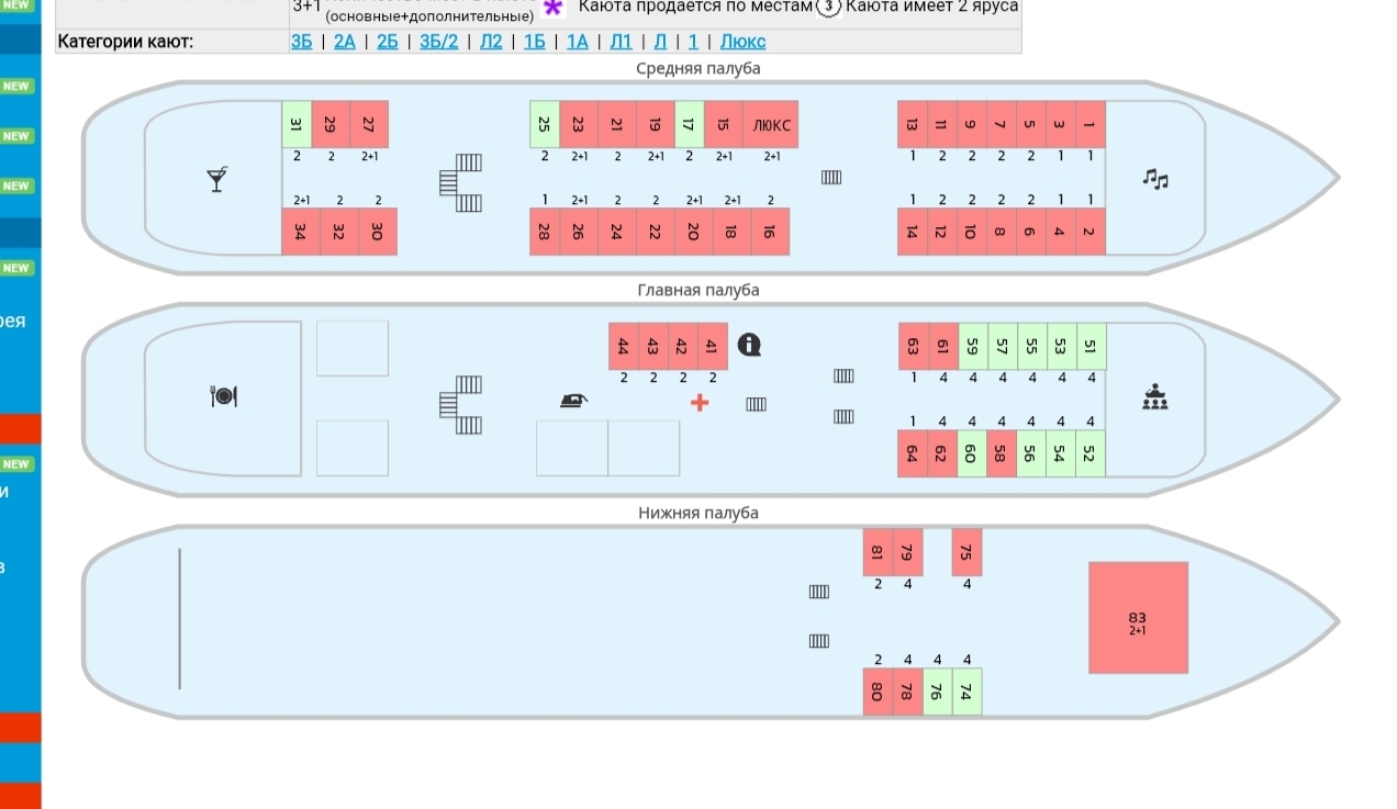 Так что доступны для бронирования сейчас всего 10 кают: 3 2ки вертикальные на средней, 7 4хместных на главной рядом с концертным залом.