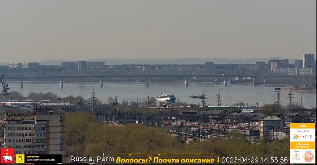 Сообщение от Дим72 29 апреля 2023 г - в 14 ч 55 мин - "В.Маяковский" у Заостровки идёт в сторону речного вокзала в Перми. Время Пермское если что, +2 часа от Московского