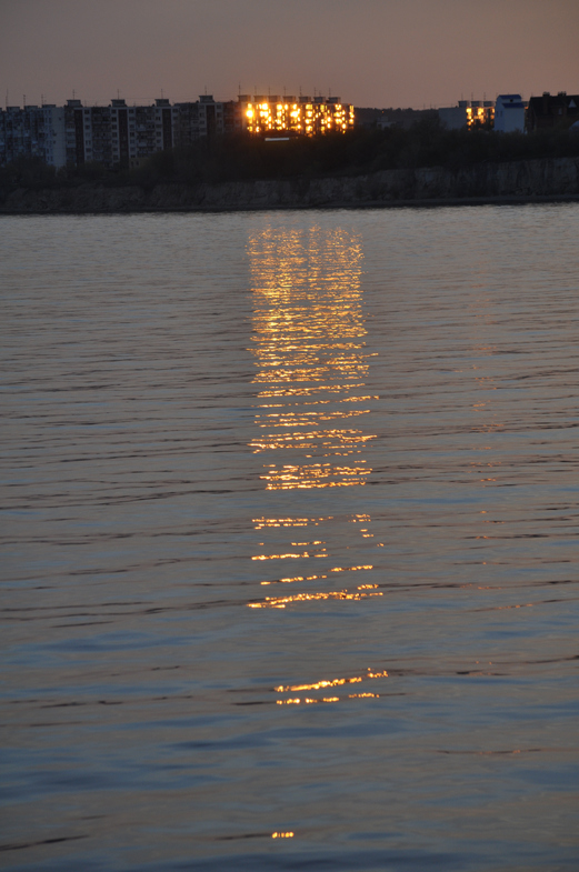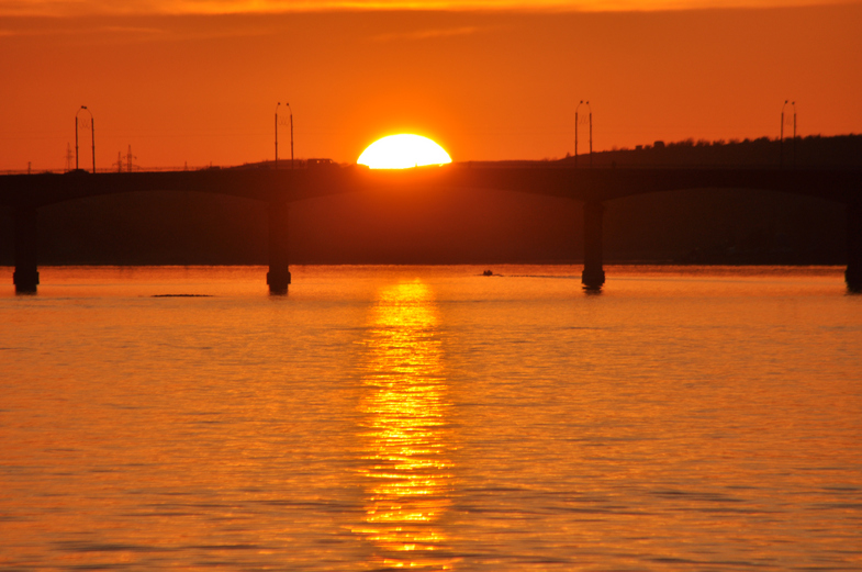 Солнце ушло под воду за мостом через речку - приток Волги. Наверное, Камышенку. )