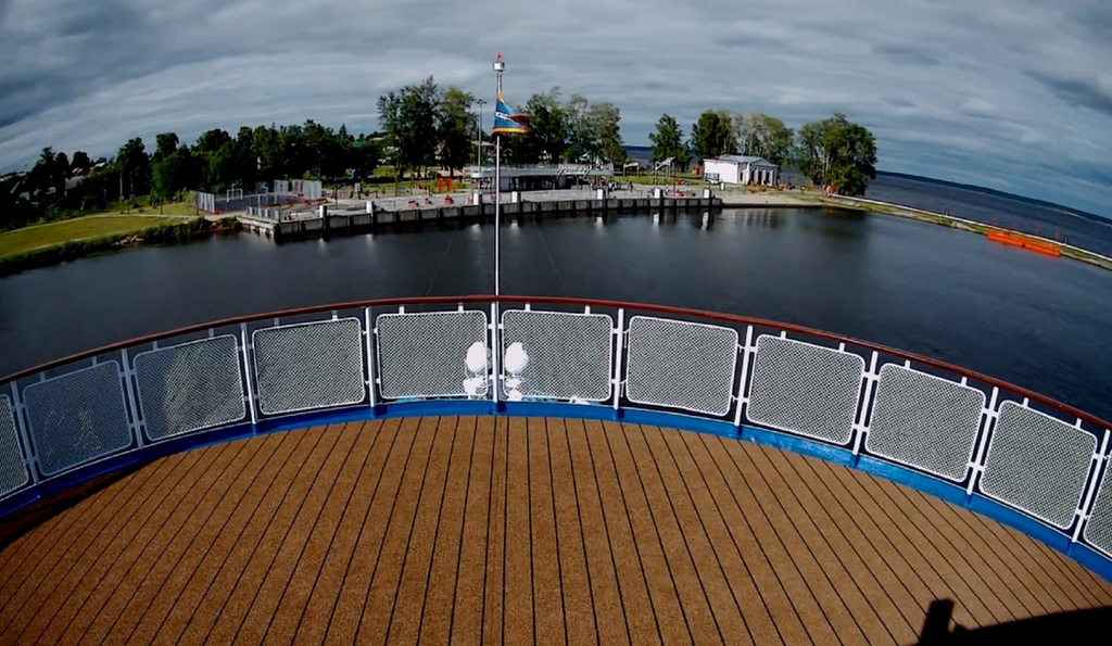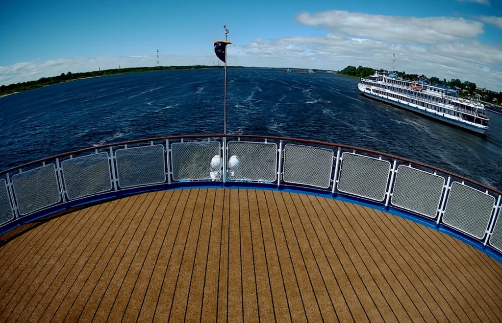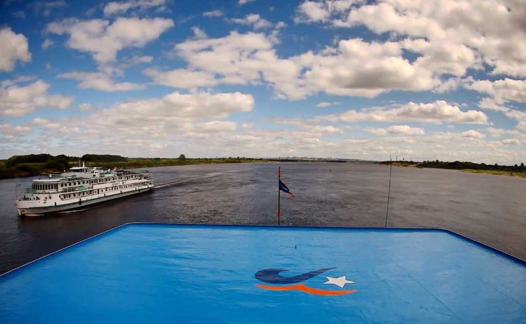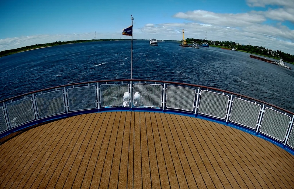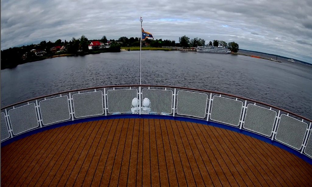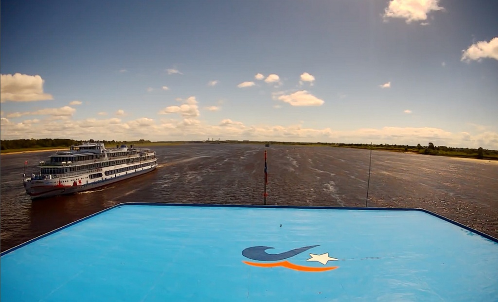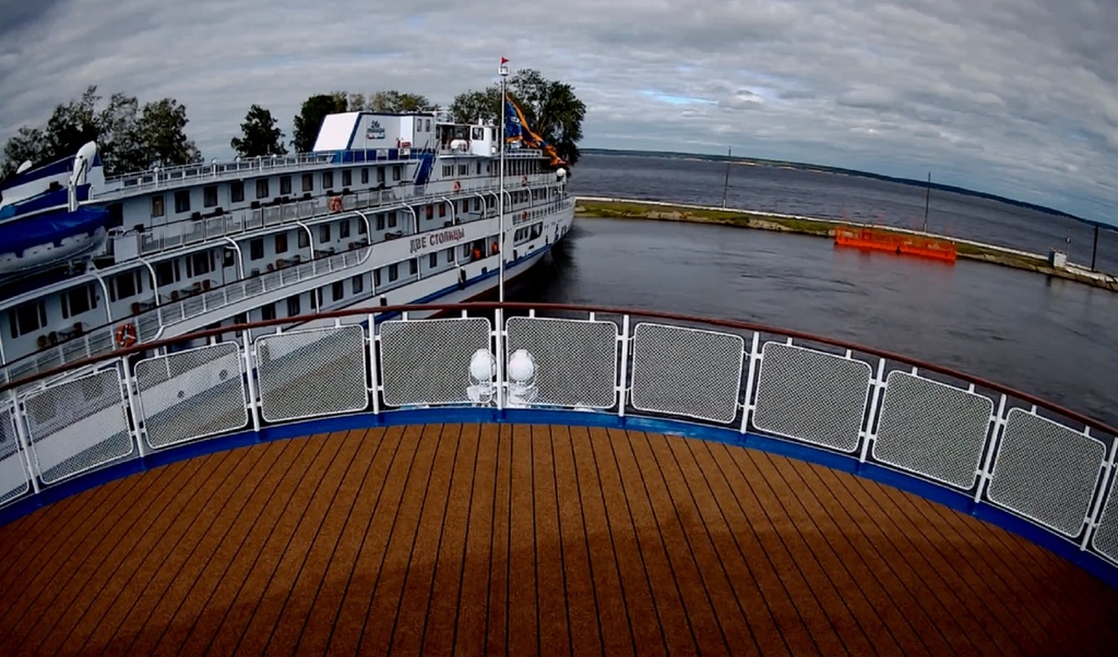 Полевой уютно устроился в одиночку на первом причале СРВ. 2 дня работает флагманом, расположившись во главе большой московской круизной эскадры. Это особенно наглядно видно с противоположного берега из Захарково. Жаль, что там нет веб камеры...
