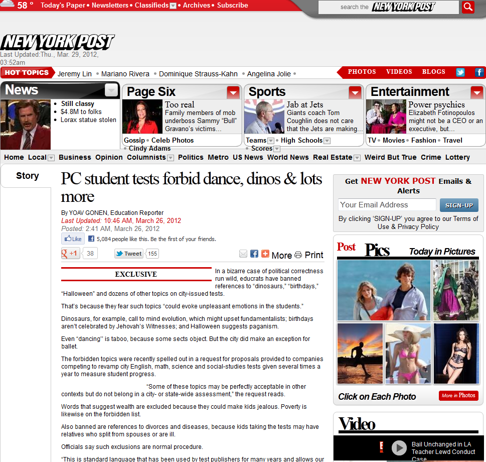 "Запрещено слово "динозавр", которое так нравилось детям со времен появления известного мультика: старый "Дино" отсылает к идее об эволюции, а говорить о ней - значит сердить креационистов, особенно после того, как один из них, Рик Санторум, нацелился на Белый дом. Запрещено слово "дансинг": слишком сексуальное и распущенное. Запрещено даже слово "день рождения": Свидетели Иеговы не отмечают дней рождений, вы можете нанести удар по чувствам маленького адепта", - пишет издание.