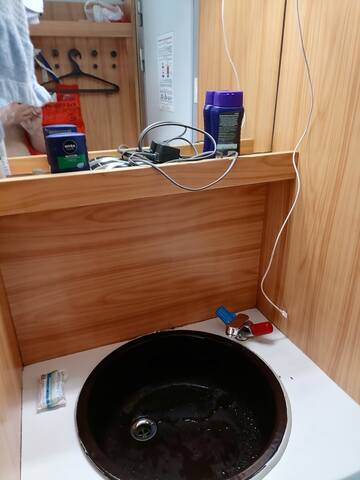 Раковина темного цвета для меня конечно нонсенс, вода горячая и холодная напор хороший, с трудом нашел единственную розетку "Фен не подключать".