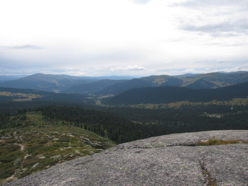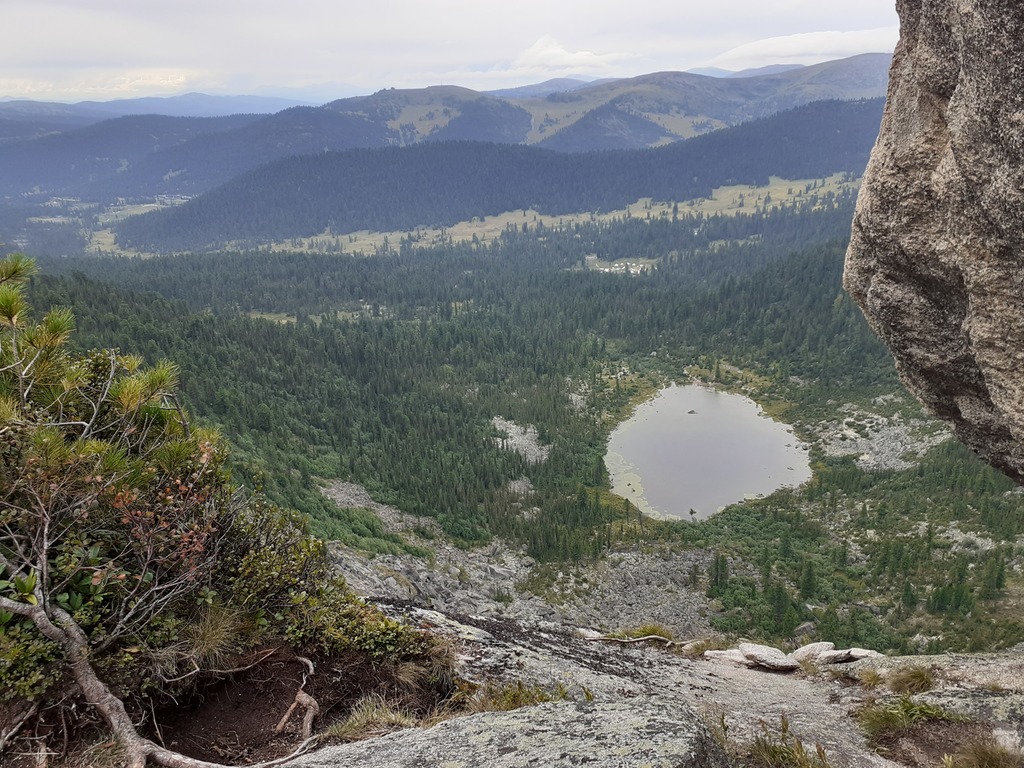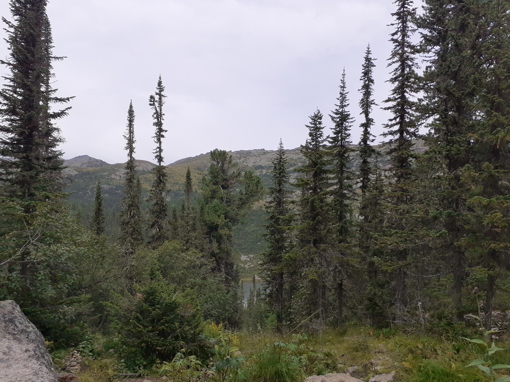 Мы пока вроде бы находимся в лесу - но этот лес растёт на крутом горном склоне. И все чаще в просветы между деревьями, или же на полянах, мы видим острые вершины пихт не НАД собой, а ПОД ногами