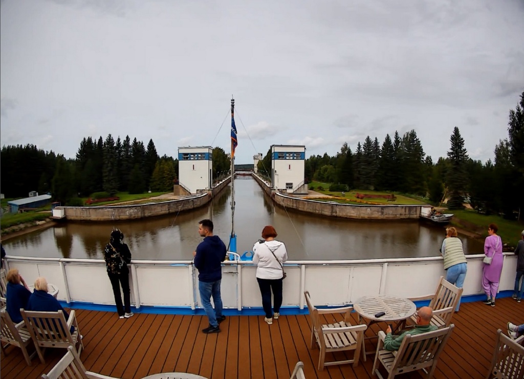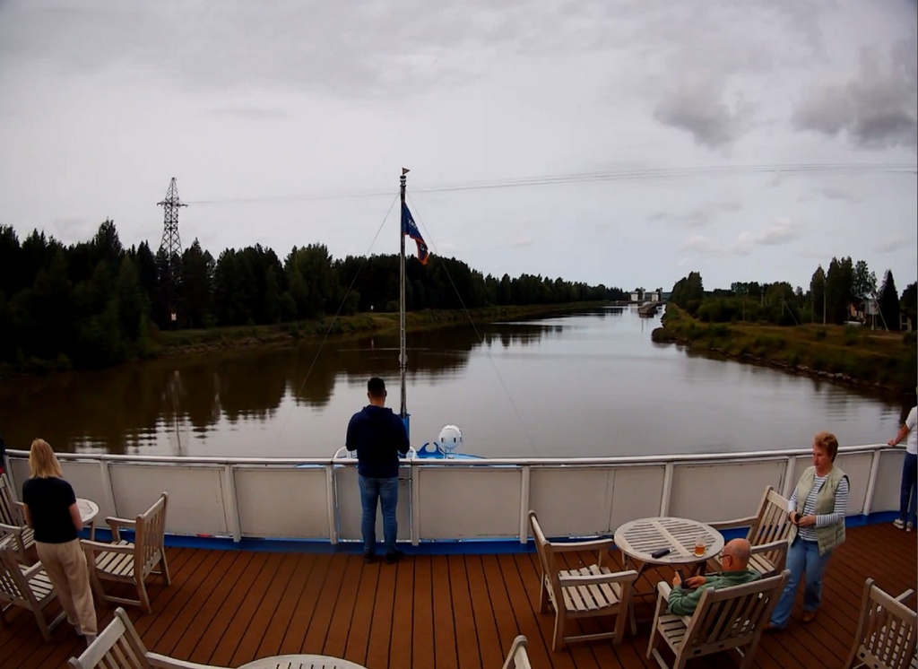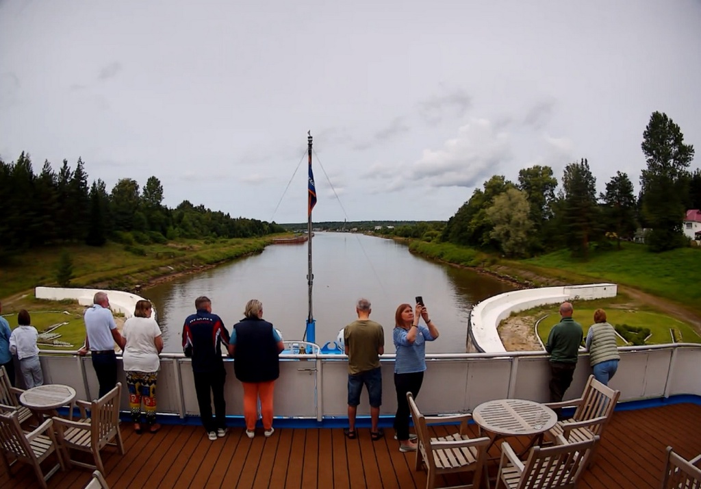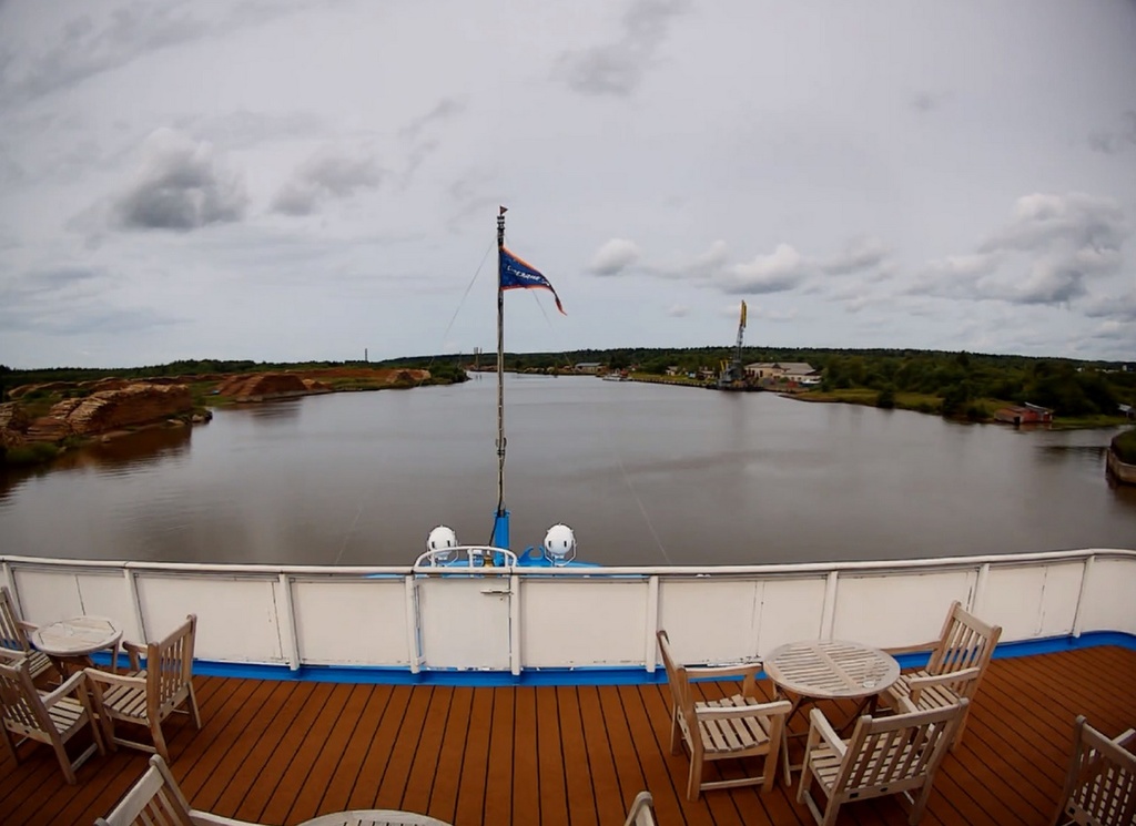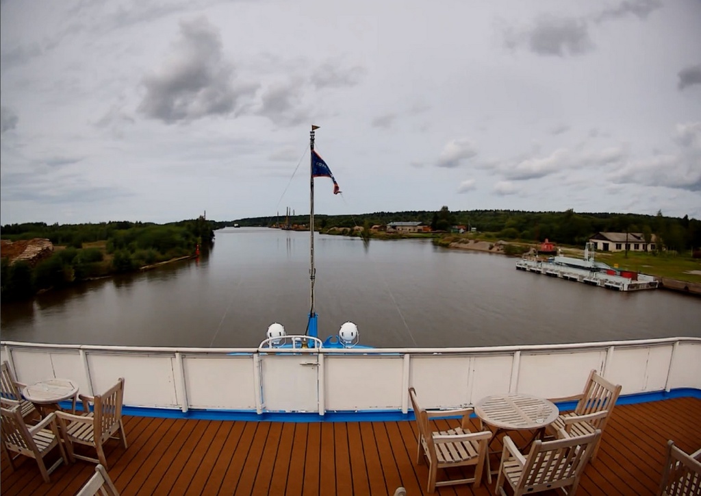 В 13.00 - "Россия" отходит от причала в Вытегре. И устремляется в сторону шлюза. народ подтянулся на нос