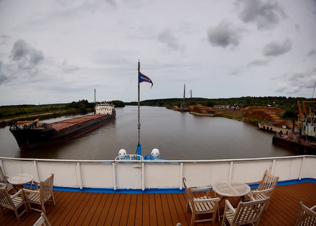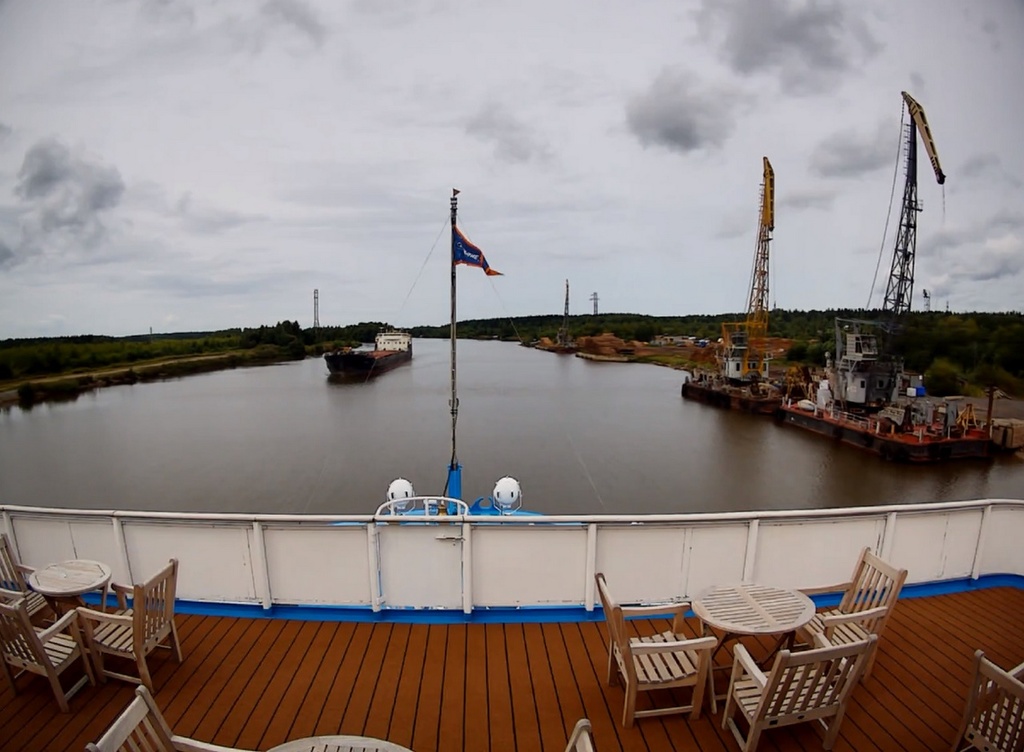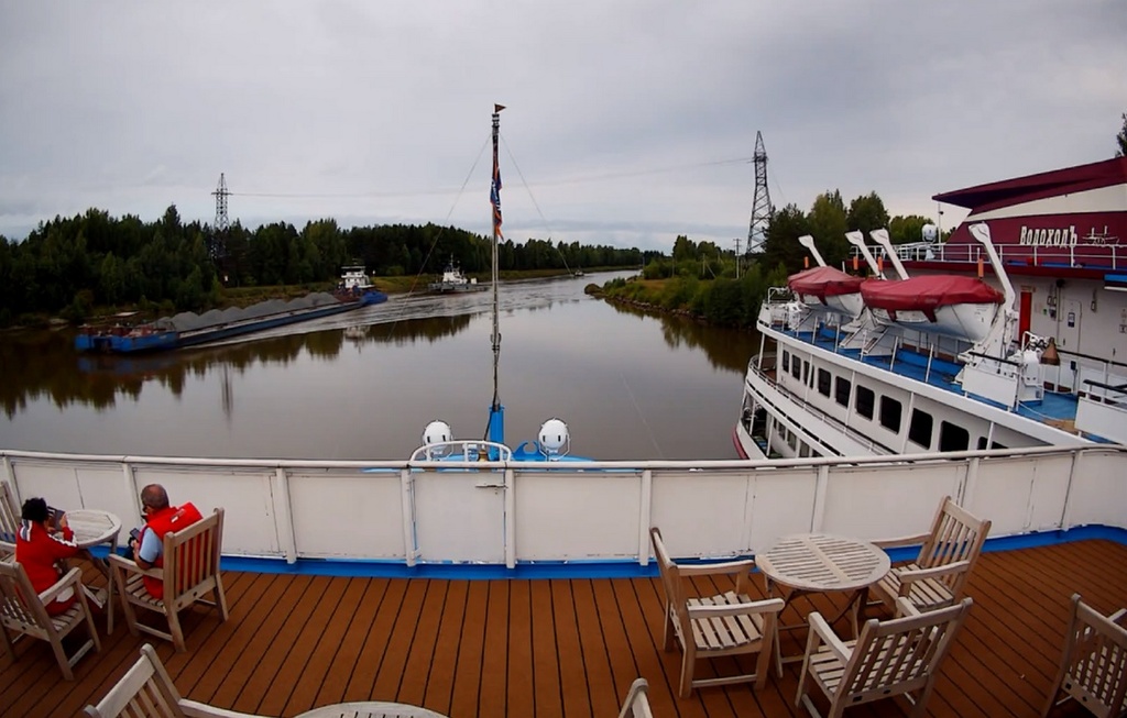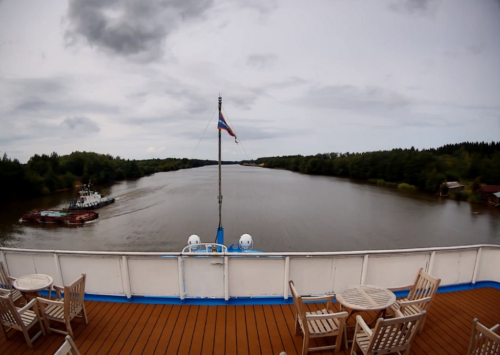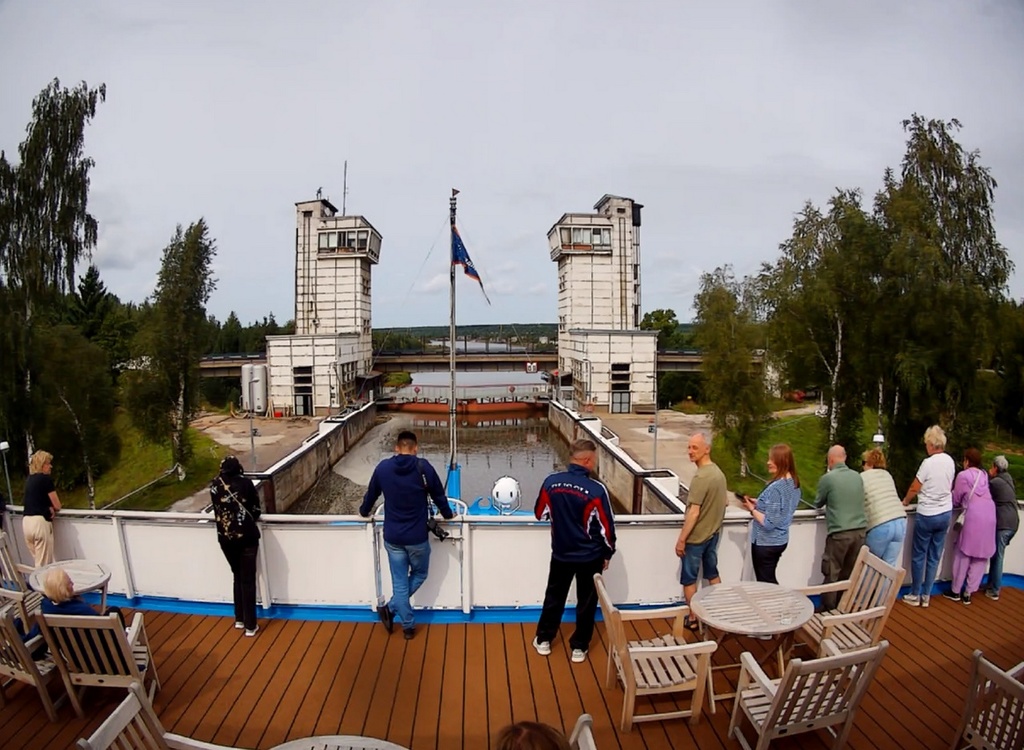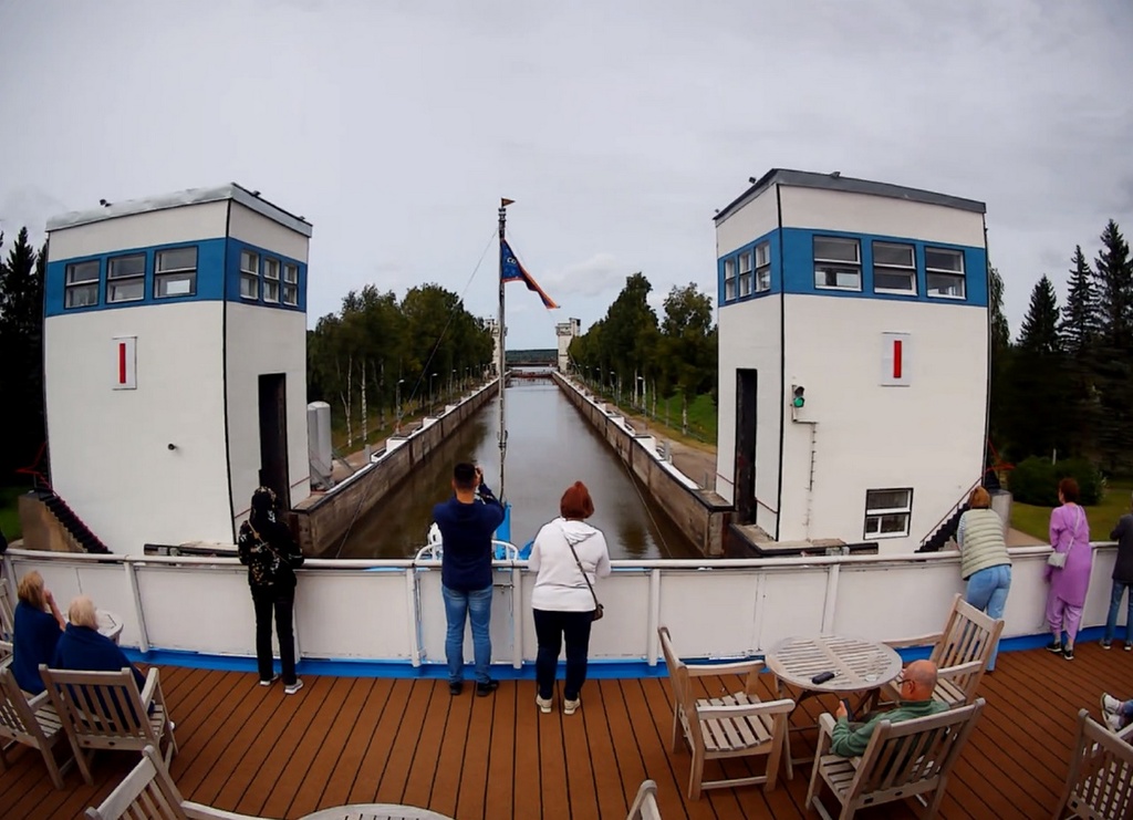 В 13.00 - "Россия" отходит от причала в Вытегре. И устремляется в сторону шлюза. народ подтянулся на нос