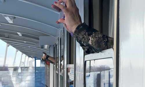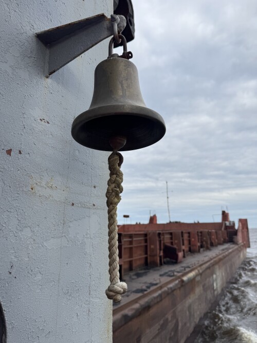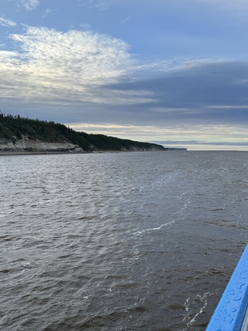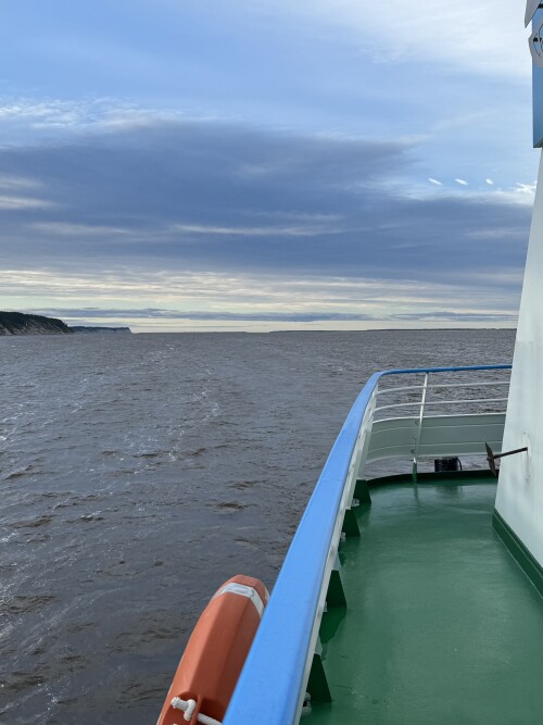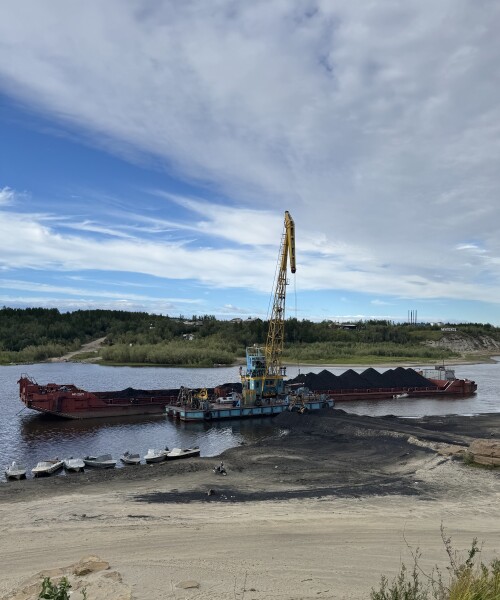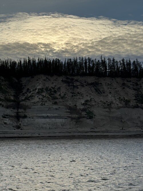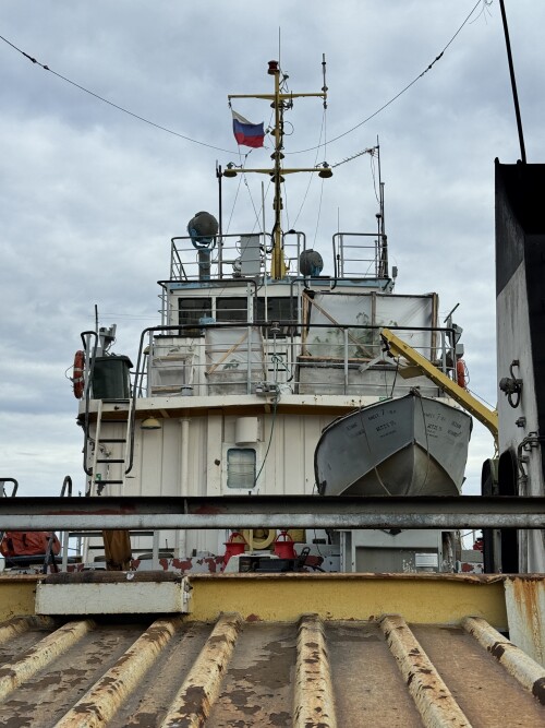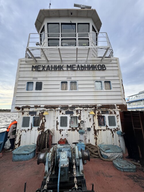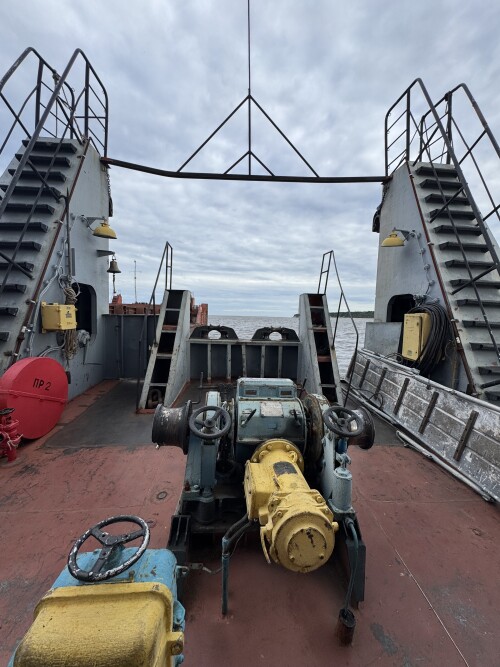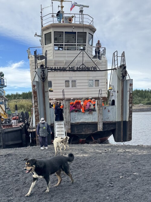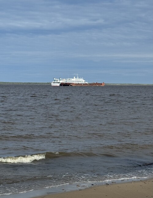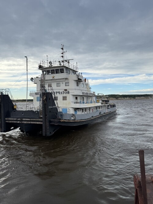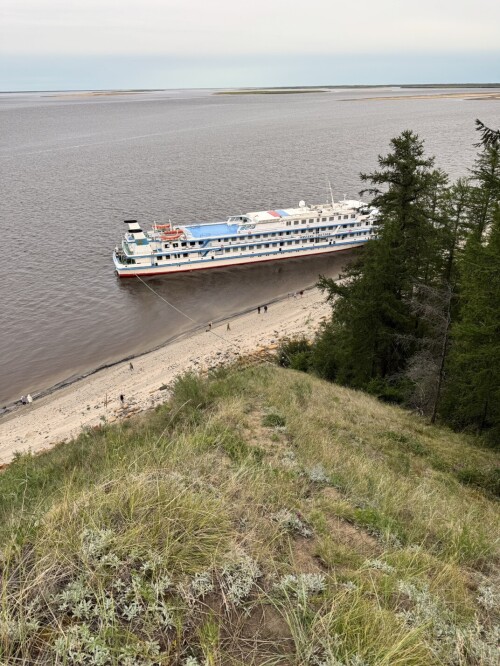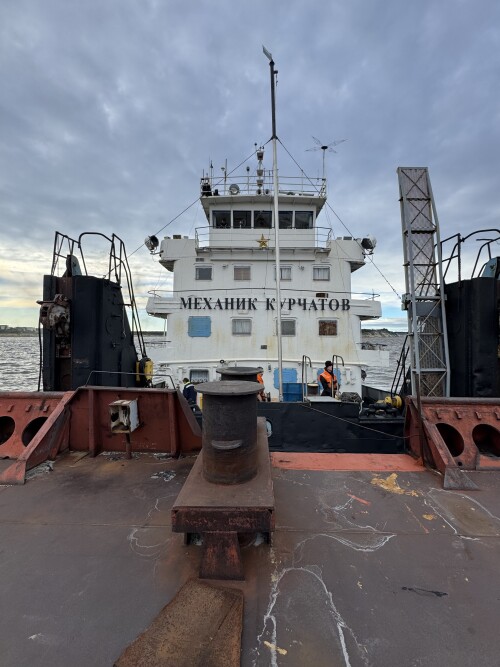 Вид с жиганского берега на пришвартованный к барже наш корабль.