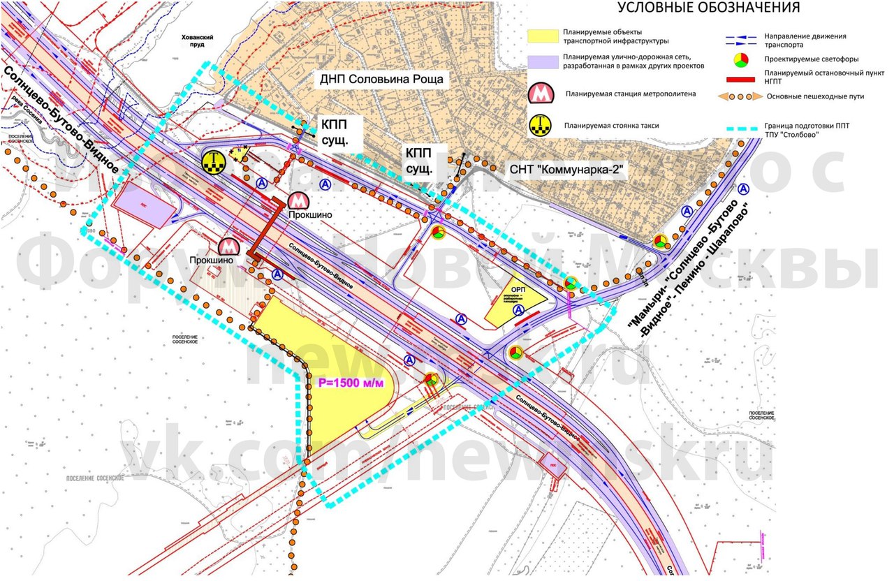 Тут предлагается организация перехватывающей парковки общей емкостью 2000 м/м и стоянку такси емкостью 20 м/м с подъездом от магистральной улицы общегородского значения «Солнцево-Бутово-Видное».
