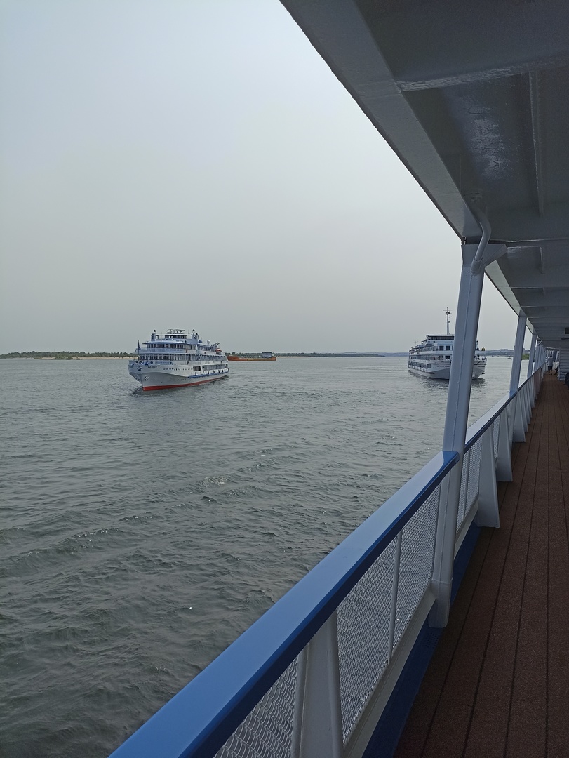 Пушкарев, проходим чебоксарский шлюз, раннее определённый 4 дек, как водоходовский, оказался Александрой из РнД . Завтрак на капитане хорош, все вкусно, обслуживание быстрое, уборка в каютах ежедневная. Утро уже очень жаркое, спасаюсь в курилке, у бара.