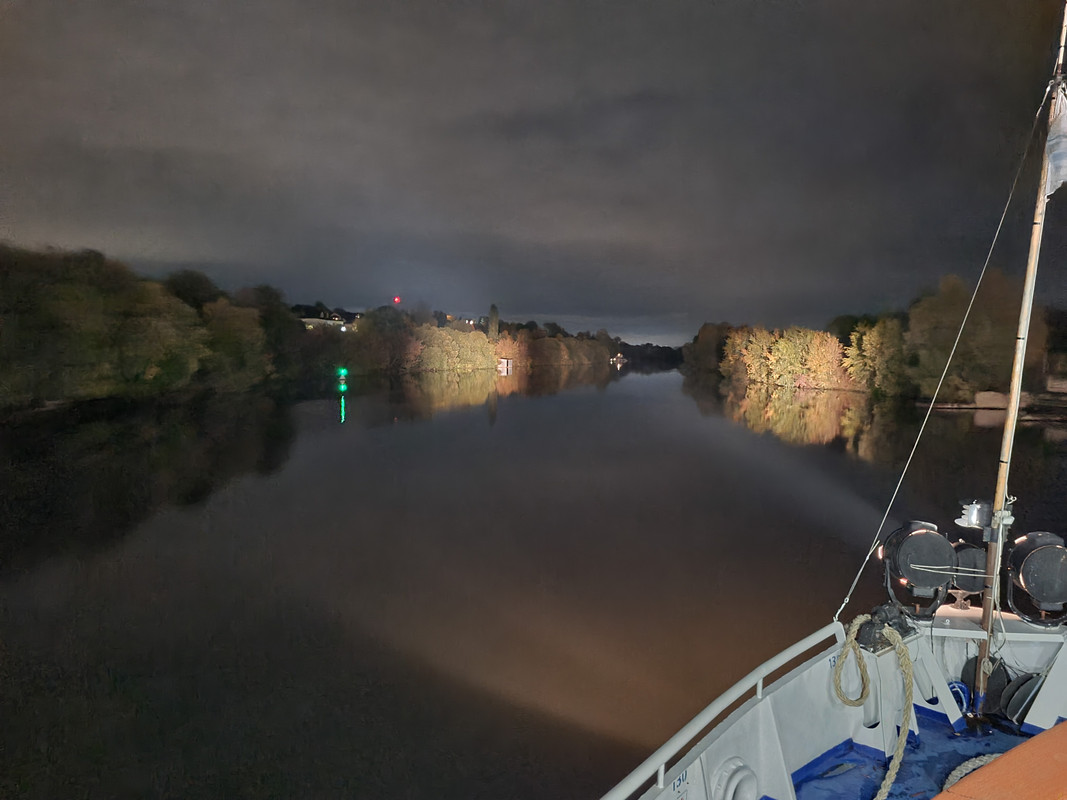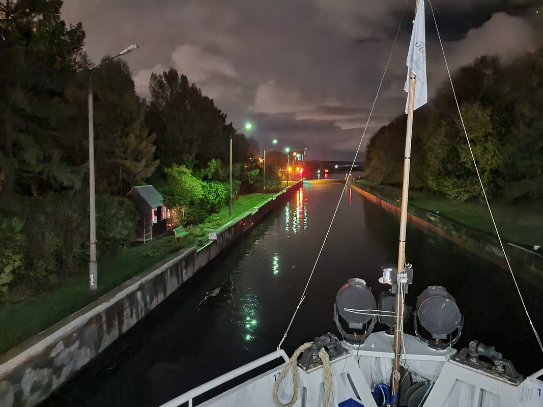 Еще пара фото с кормы и носа в шлюзе ночью.