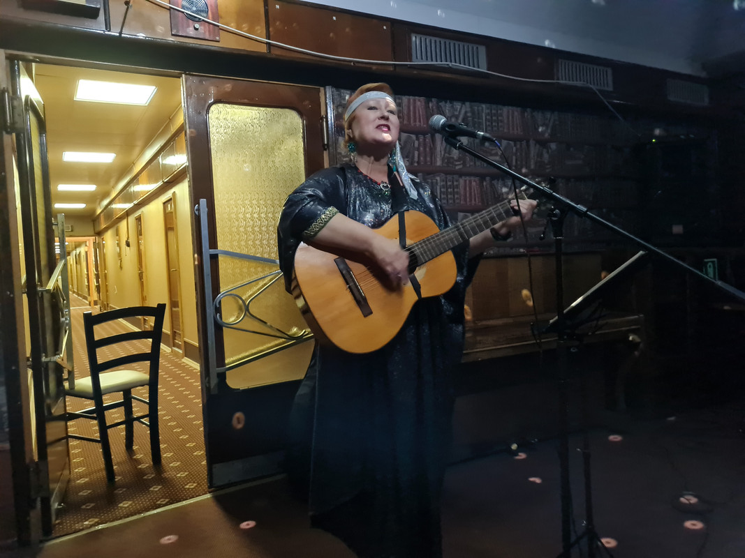 А тем временем мы движемся по Москве реке, и сейчас началась, культурно музыкальная программа.
