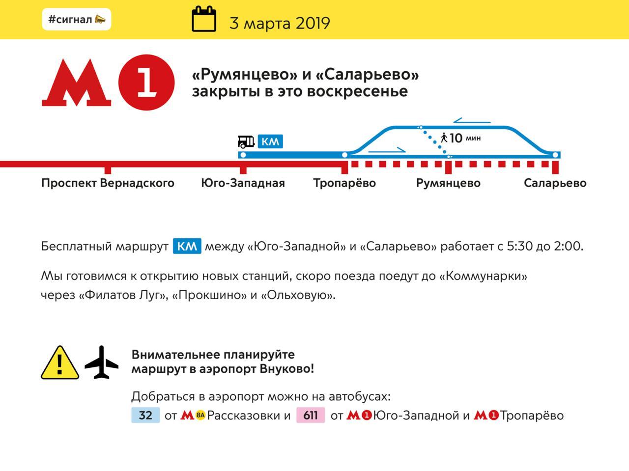3 марта будут закрыты станции «Румянцево» и «Саларьево». Поезда будут курсировать от Бульвара Рокоссовского до Тропарёво. Это необходимо для подключения новых станций «Филатов Луг», «Прокшино», «Ольховая» и «Коммунарка» к сети метрополитена.