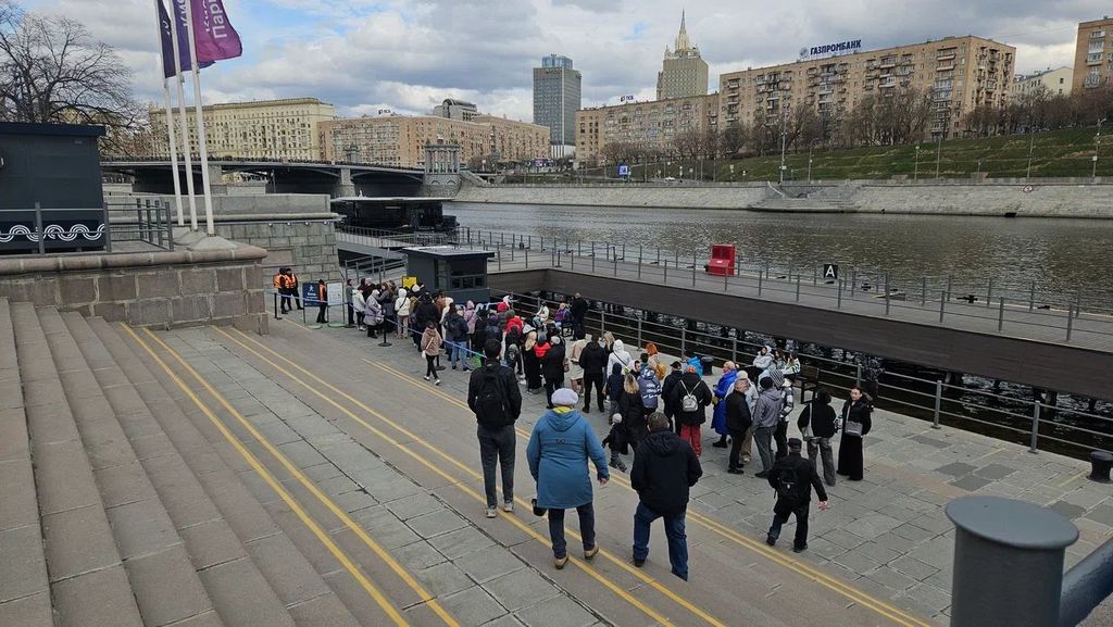 Если присмотреться, то в середине очереди заканчивается синий забор (ограждение). На нем стоит знак: очередь на 1,5 часа. И это примерно так и было. В одну Синичку входит 30 человек. Сотрудники считают внимательно и четко. Учтите, что группа, которая пойдет на посадку, уже ушла вперед, на причал. Когда мы подошли, до нас стояло человек 70, и + 30 уже ушедших. Вот и считайте, 100 человек - мы бы попали на 4ю посадку. Они каждые 25 минут. Плюс еще пропущенная... В общем, холодно было. Да и время терять ради чего.
