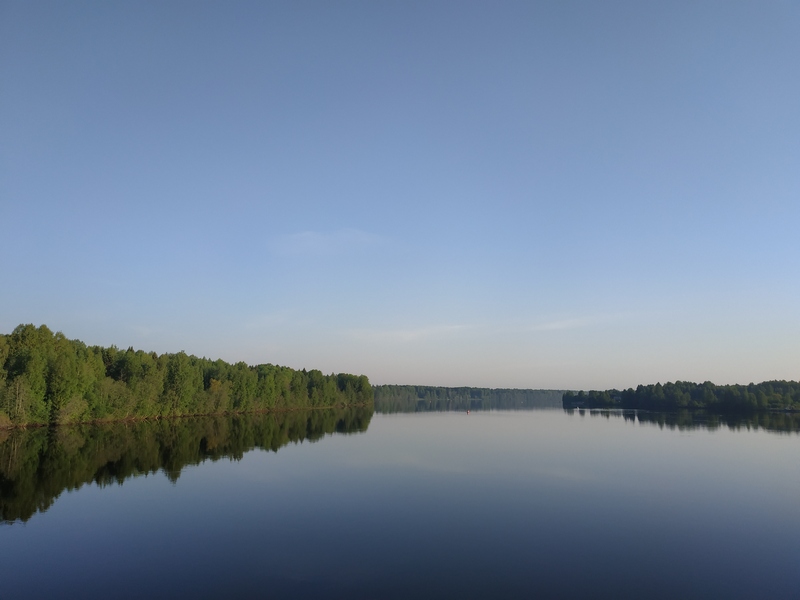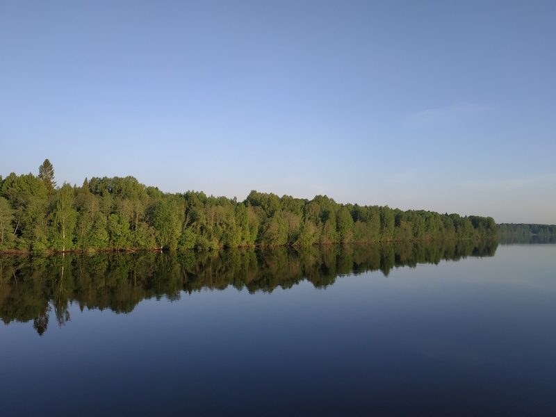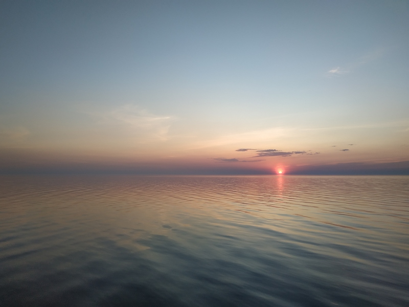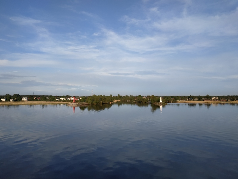 А тем временем теплоход выходит в Ладожское озеро, удивительно спокойное... Горизонта почти нет, но заметно, что Земля круглая
