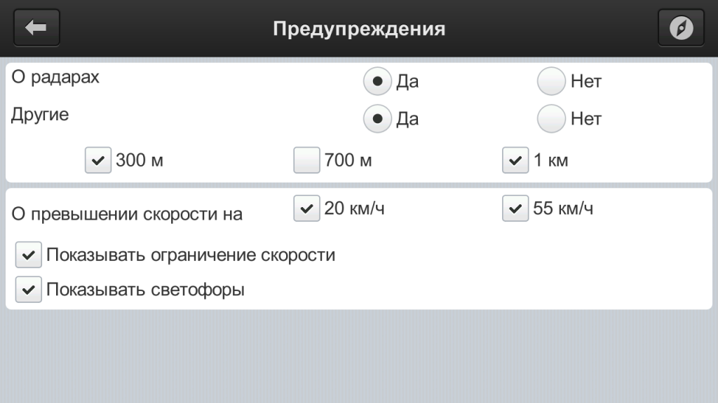 Вот в этом месте она произносит "Камера контроля скорости". До этого говорит "Через 300, (700м, 1 км) метров камера контроля скорости". Камеры реально совпадают . На мой взгляд это несколько удобнее Яндексовской пищалки, которая теринькает неизвестно за сколько и самое главное Яндекс их стока на тыкал в моем районе... (ой мама не горюй - на одном мосту длиной 100 метров аж 4 штуки в одном направлении, 3 штуки на соседних домах на удалении 50 метров от моста, а некоторые даже не показывал, которые были у Рамблера)