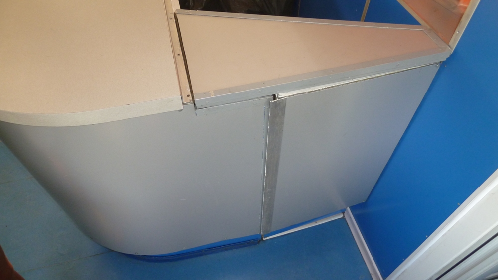 Слева по ходу (т.е. за нижней границей кадра) есть небольшая дверка-ширма. За спиной продавца - полки со стёклами в нише, справа - небольшая раковина. По краям на стене - два светильника-бра и зеркала.