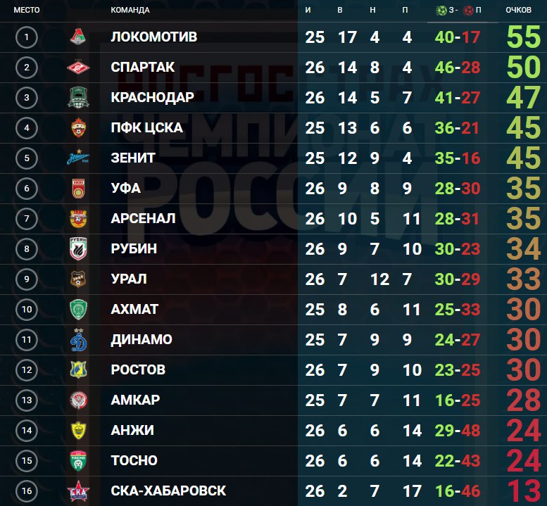 В среду три перенесенных матча РФПЛ и таблица примет нормальный вид по количеству игр.