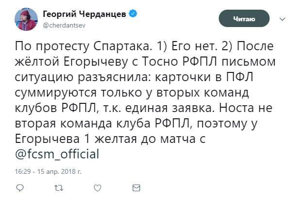 От себя, не знаю какой регламент касаемо желтых карточек разных лиг, красные переносятся однозначно. Однако представители Урала заявили что подавали перед игрой запрос в Лигу и получили четкий ответ, что Егорычев играть может.