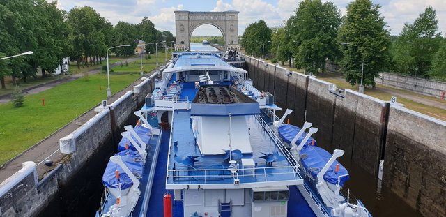 Хоть Суриков ушел раньше на полчаса шлюзовались около семи вместе. Сейчас идём за ним.