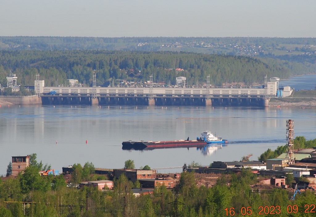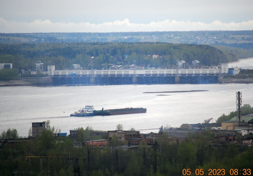 Вот сегодняшнее фото для подтверждения. Из шлюза вниз вышел толкач ОТ-2055 с баржами приставками, загруженными наполовину.