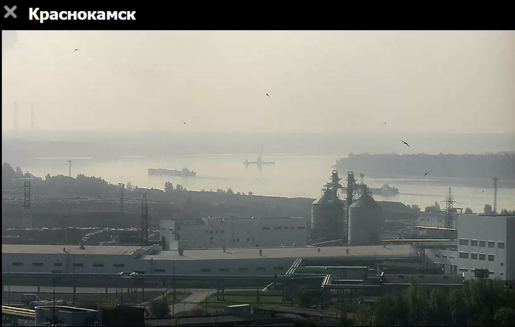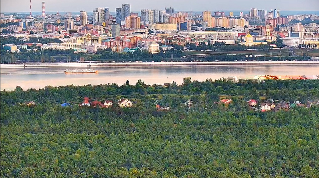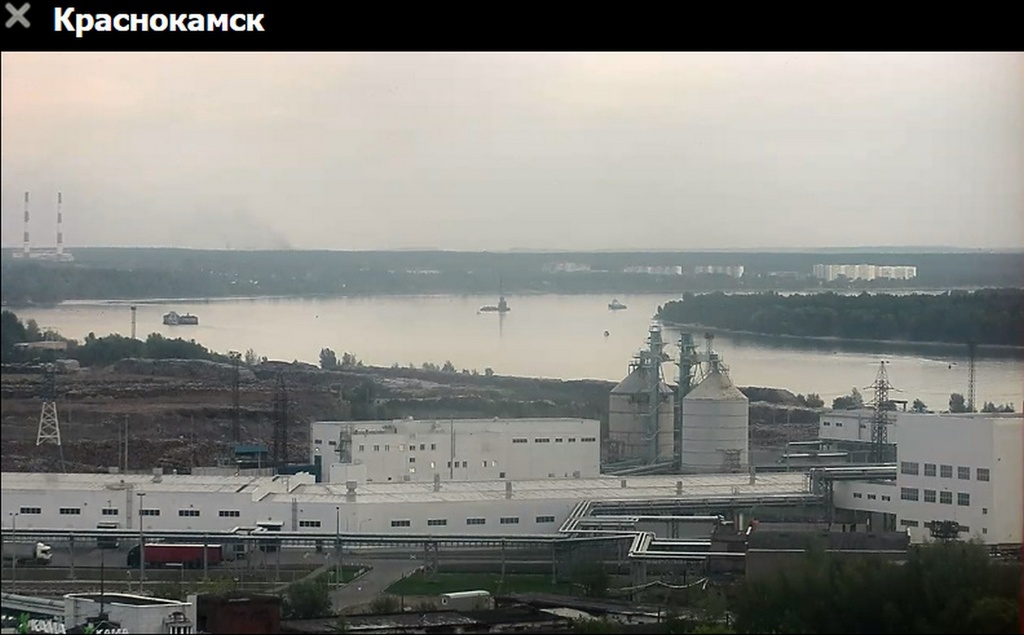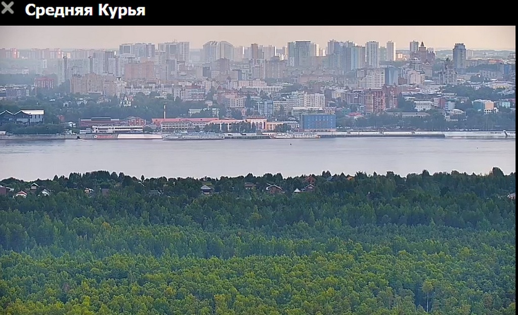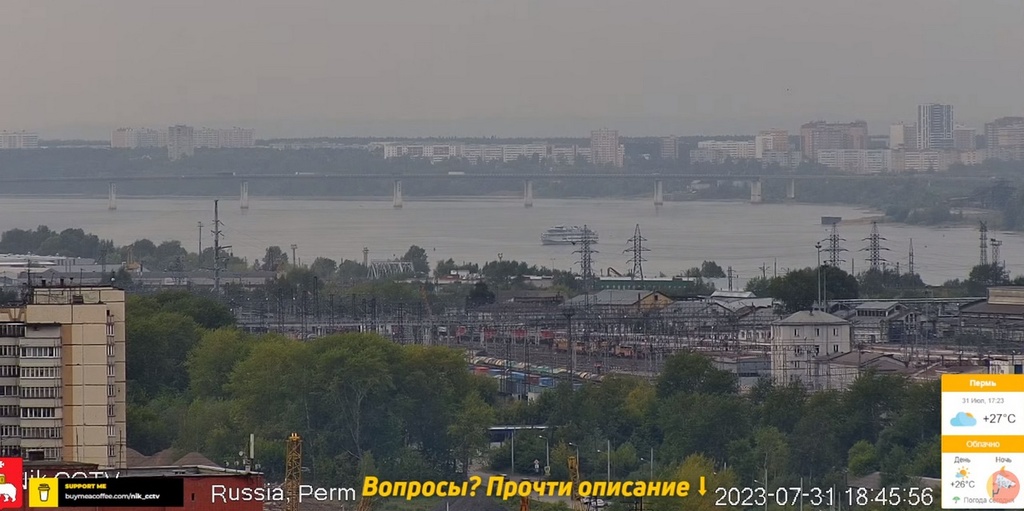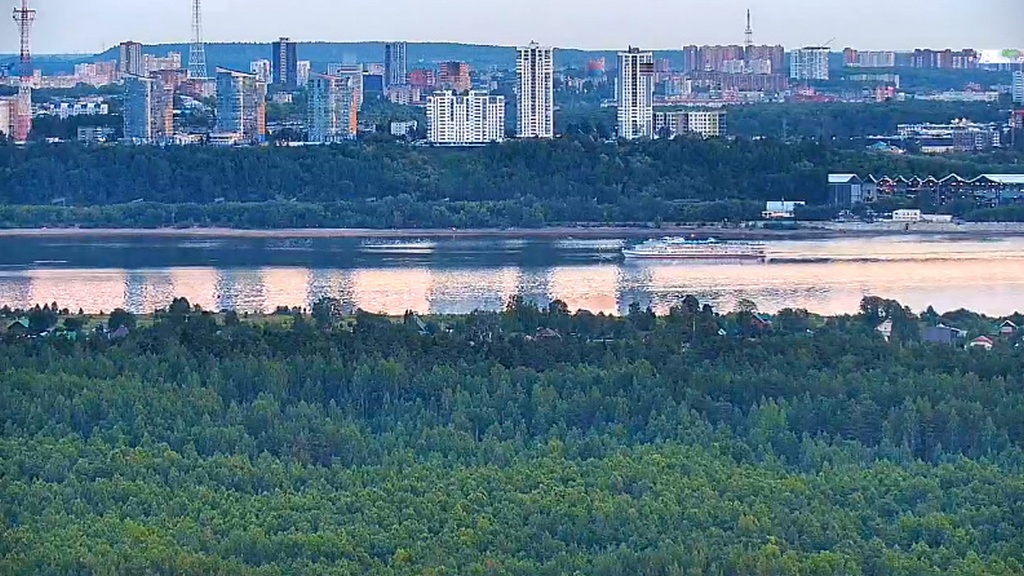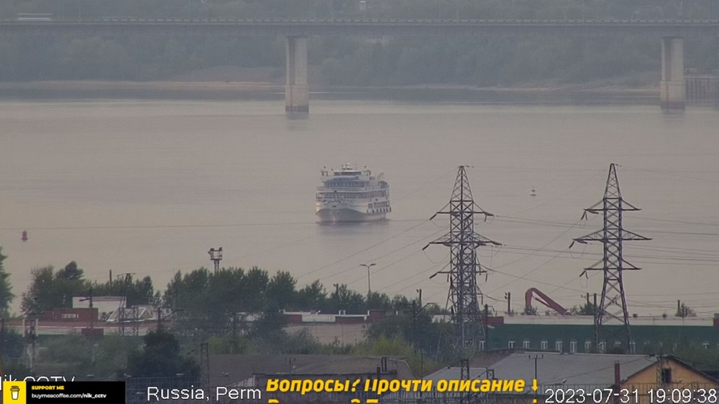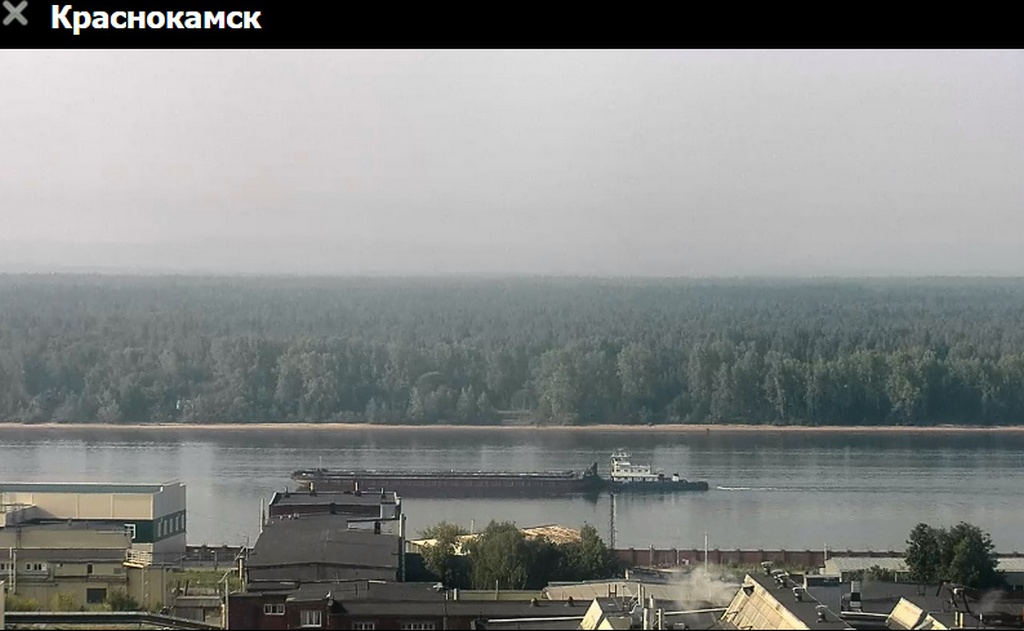 31 июля 2023 г - в 19.15-вид на Каму с вэб камеры в Краснокамске. На реке видно толкач типа "Шлюзовой", плавкран, и идущий вверх толкач ОТА-855 с двумя баржами.
