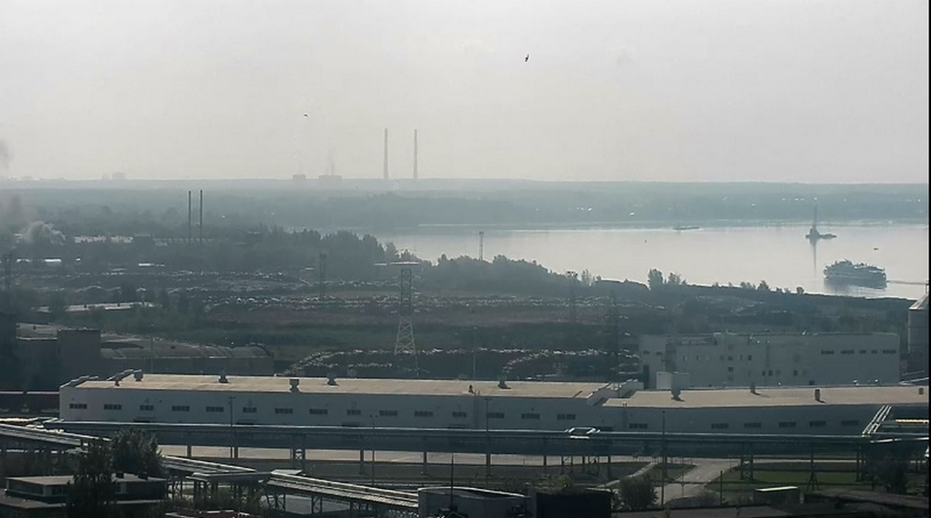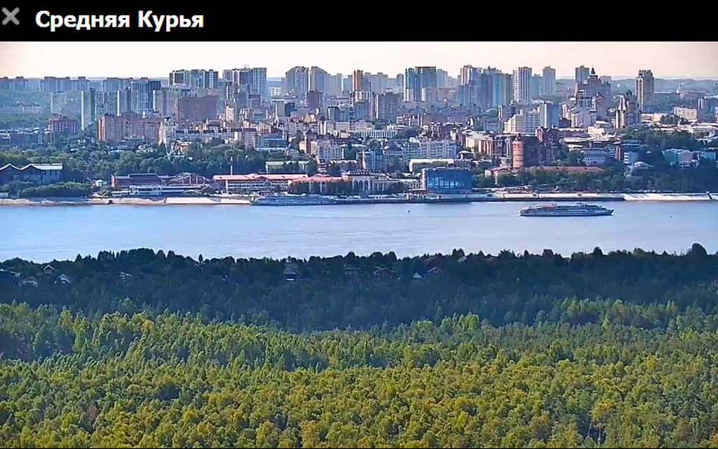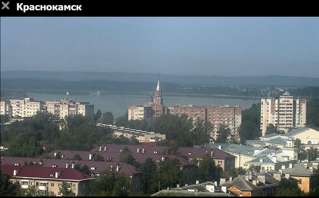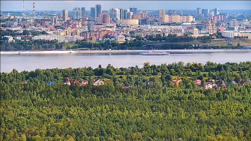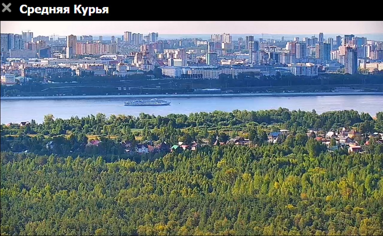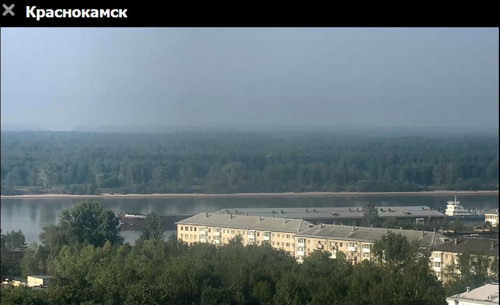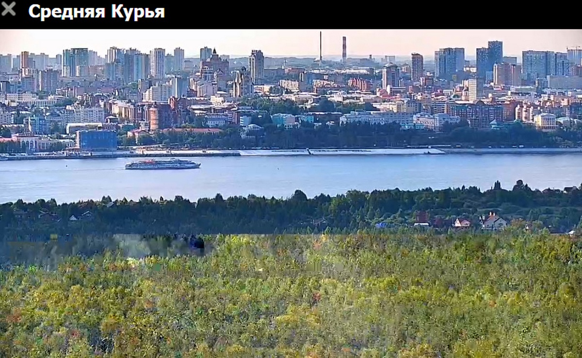 31 июля 2023 г - в 19.15-вид на Каму с вэб камеры в Краснокамске. На реке видно толкач типа "Шлюзовой", плавкран, и идущий вверх толкач ОТА-855 с двумя баржами.