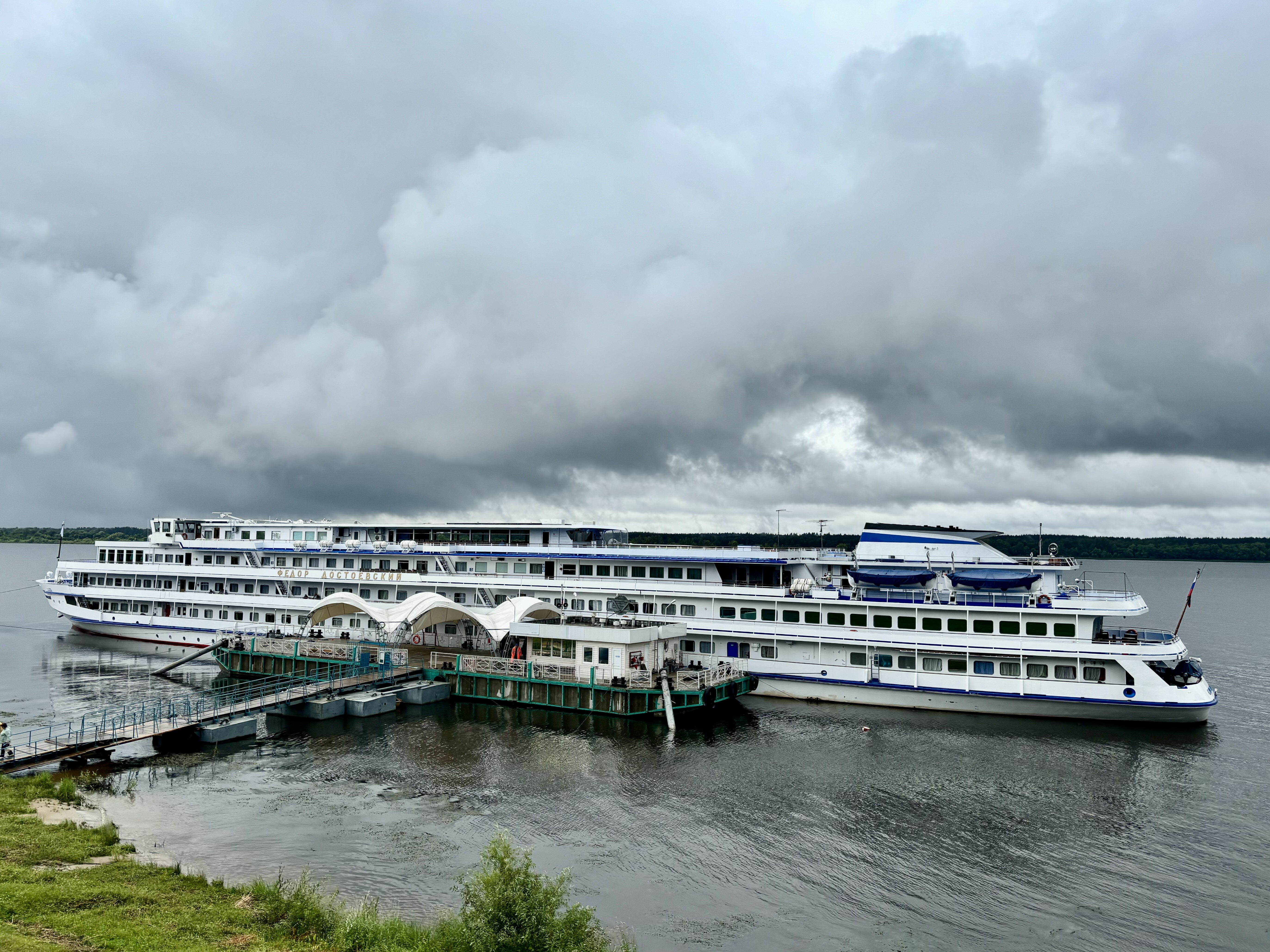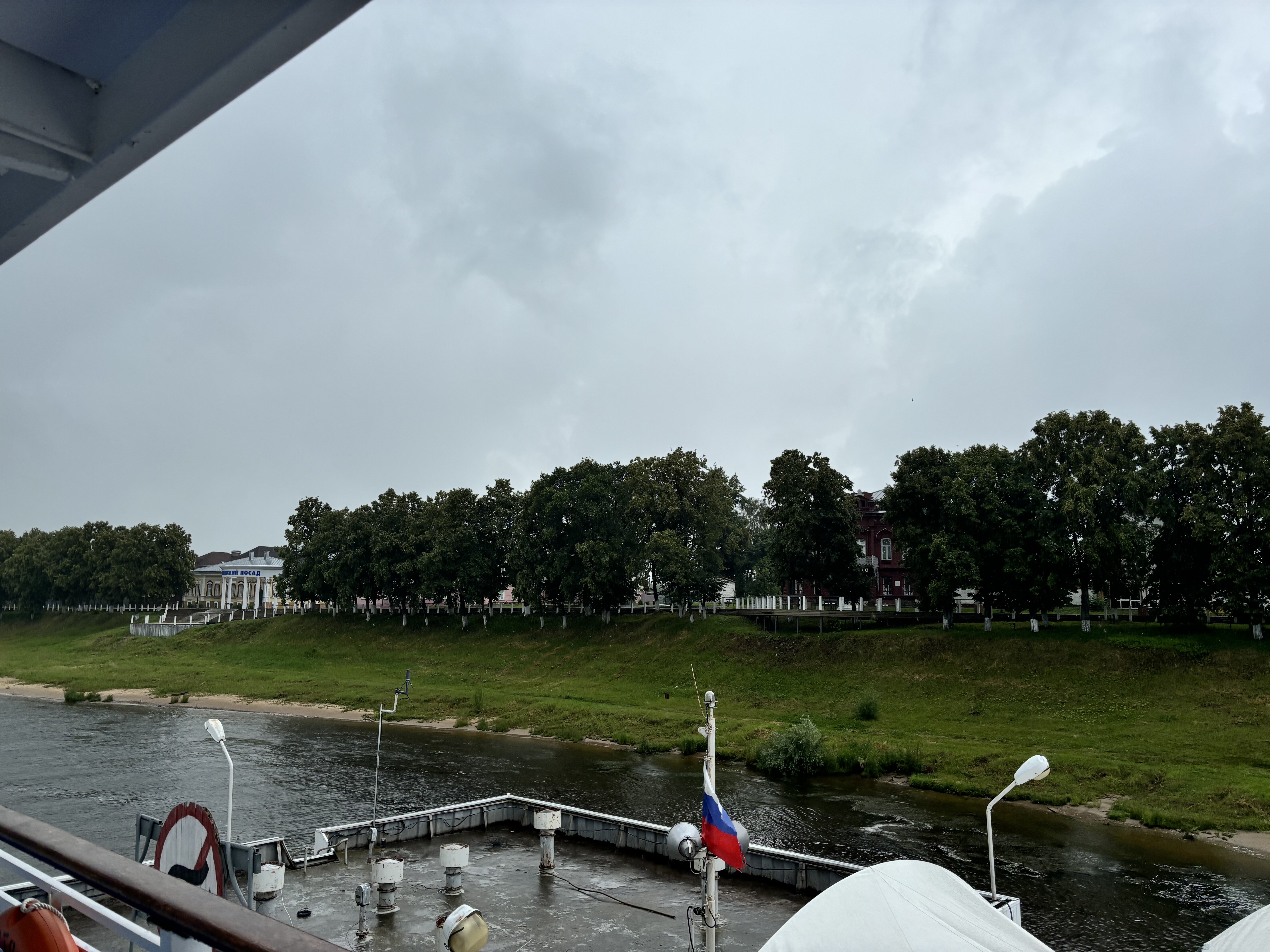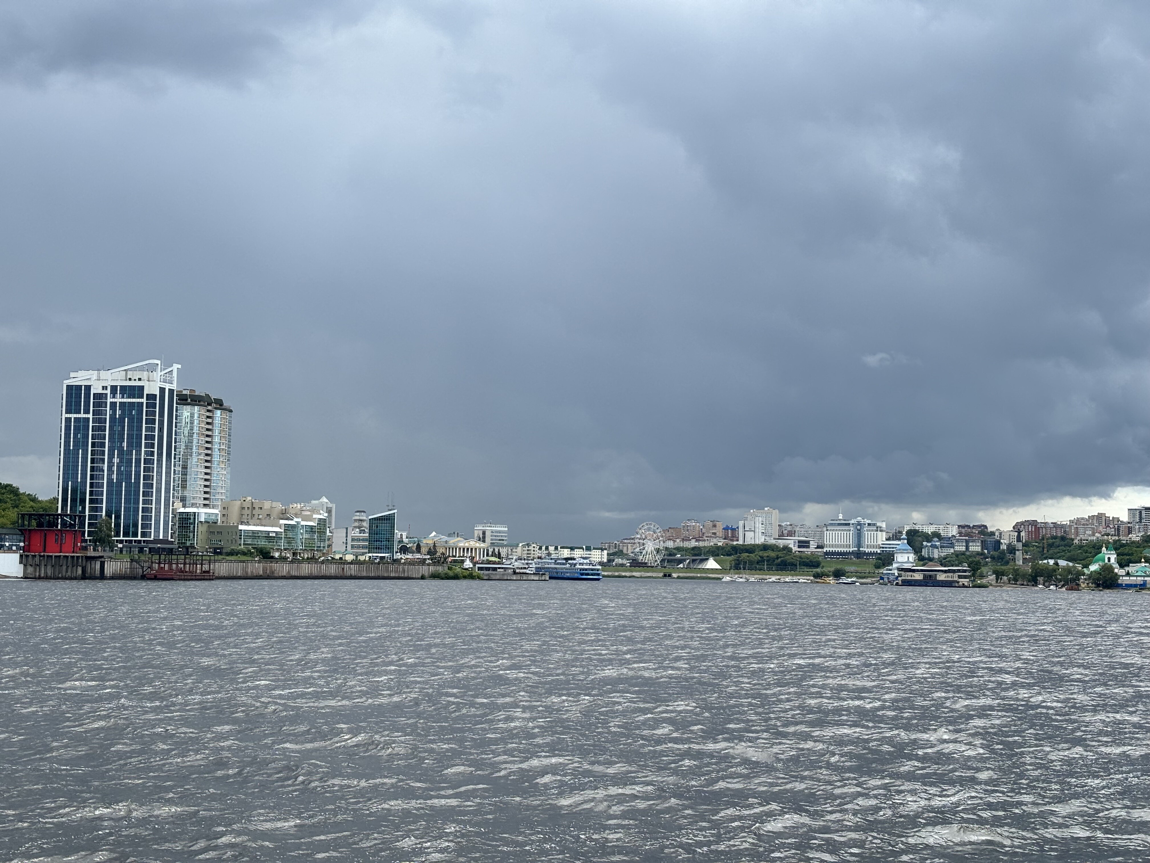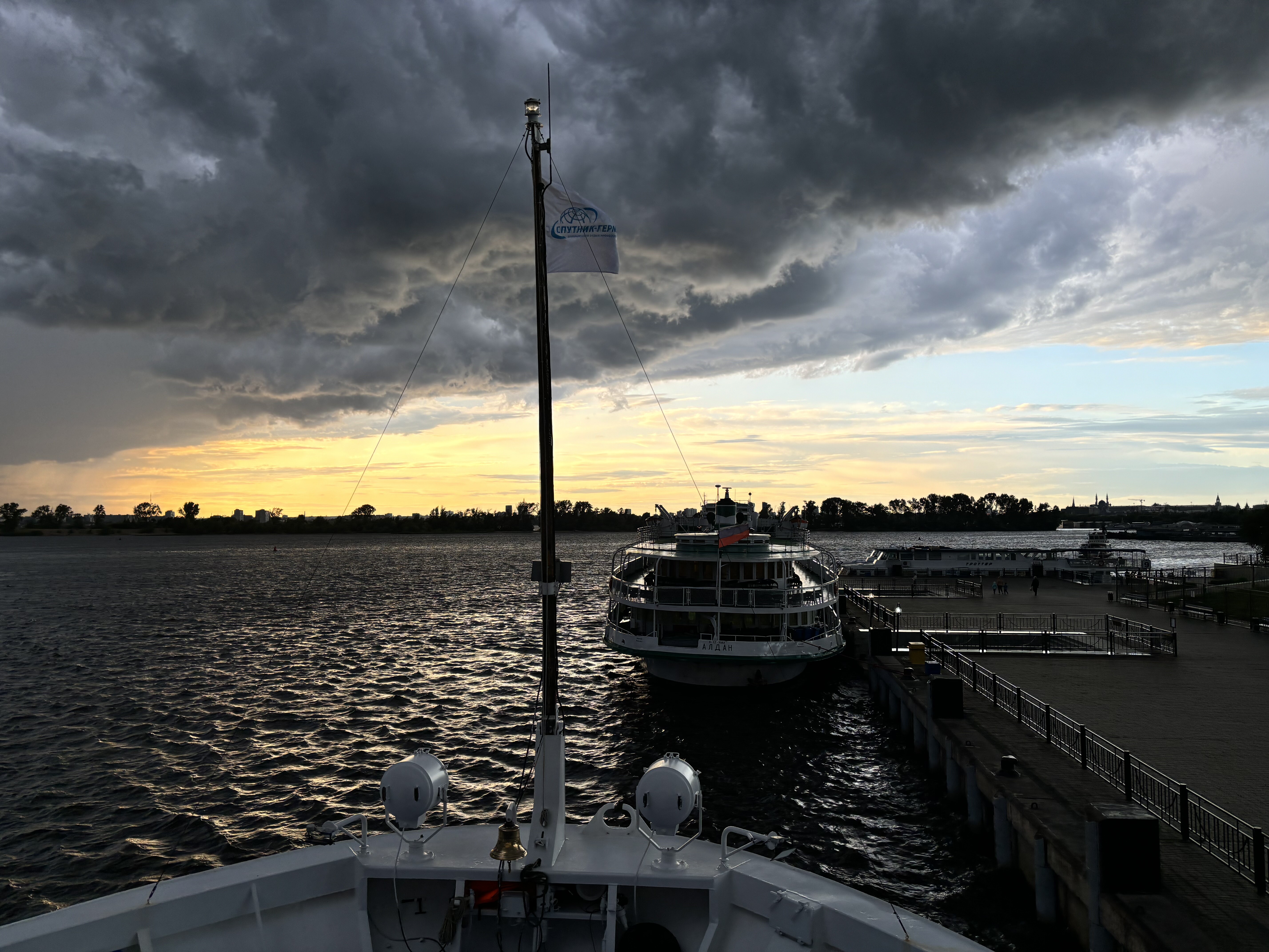 Гуляем мы гуляем и видим сгущающиеся тучи. Решаем выдвинуться по направлению к теплоходу от греха подальше) Только мы доходим до киоска Акконд на причале и разражается такой ливень, которых мы давно не видывали. Минут 20 прячемся вместе с остальными туристами внутри киоска и делаем кассу)))