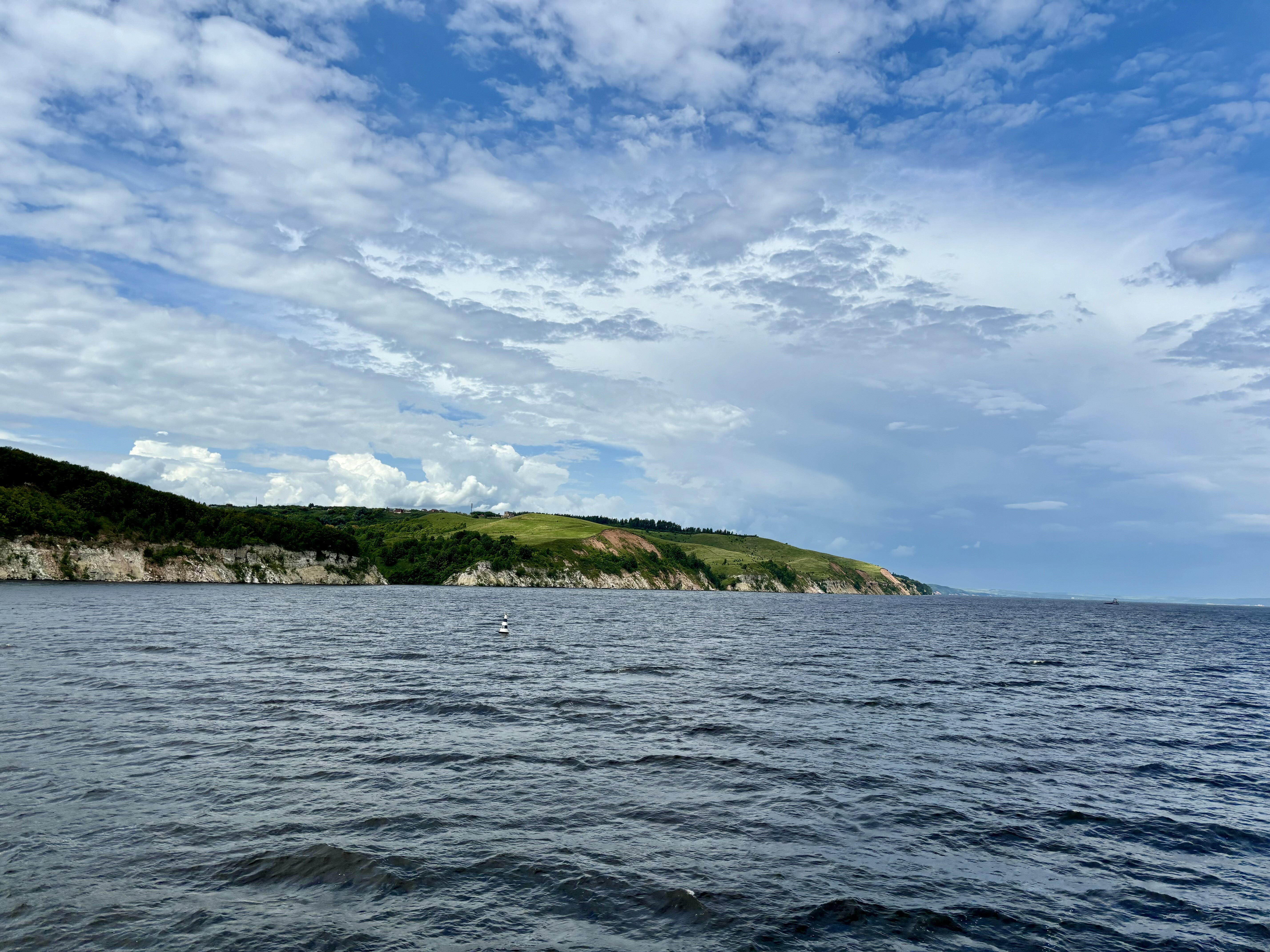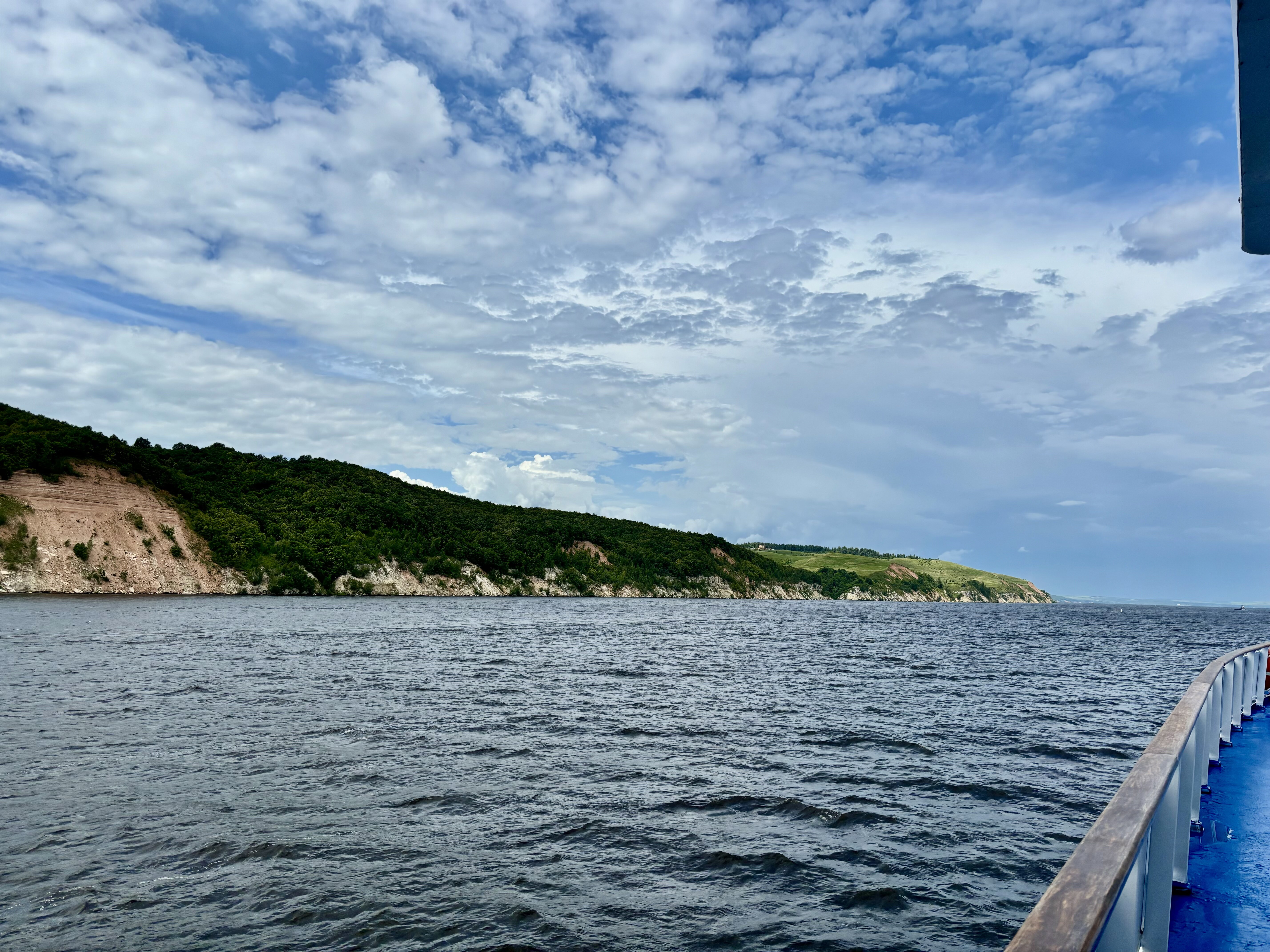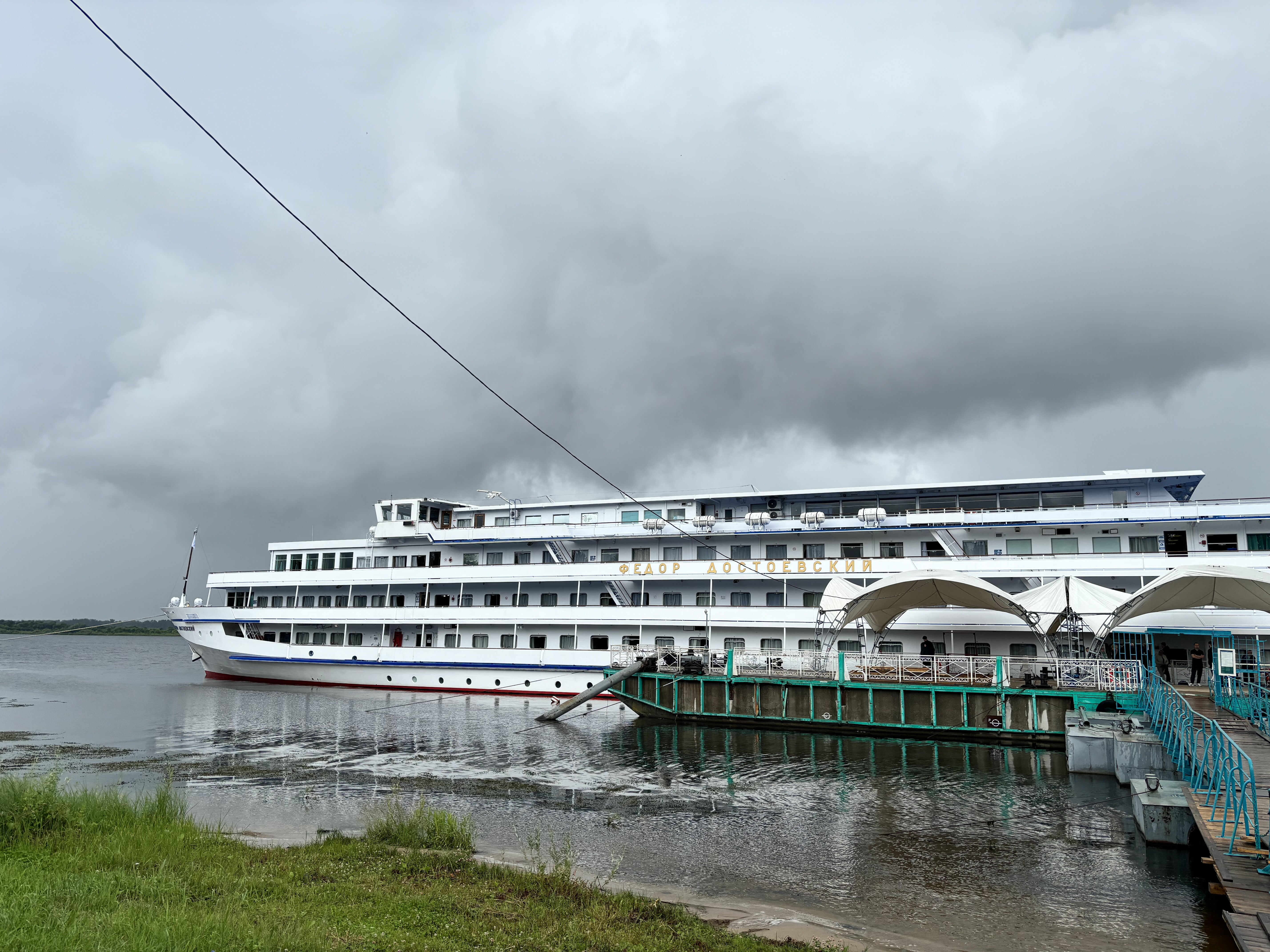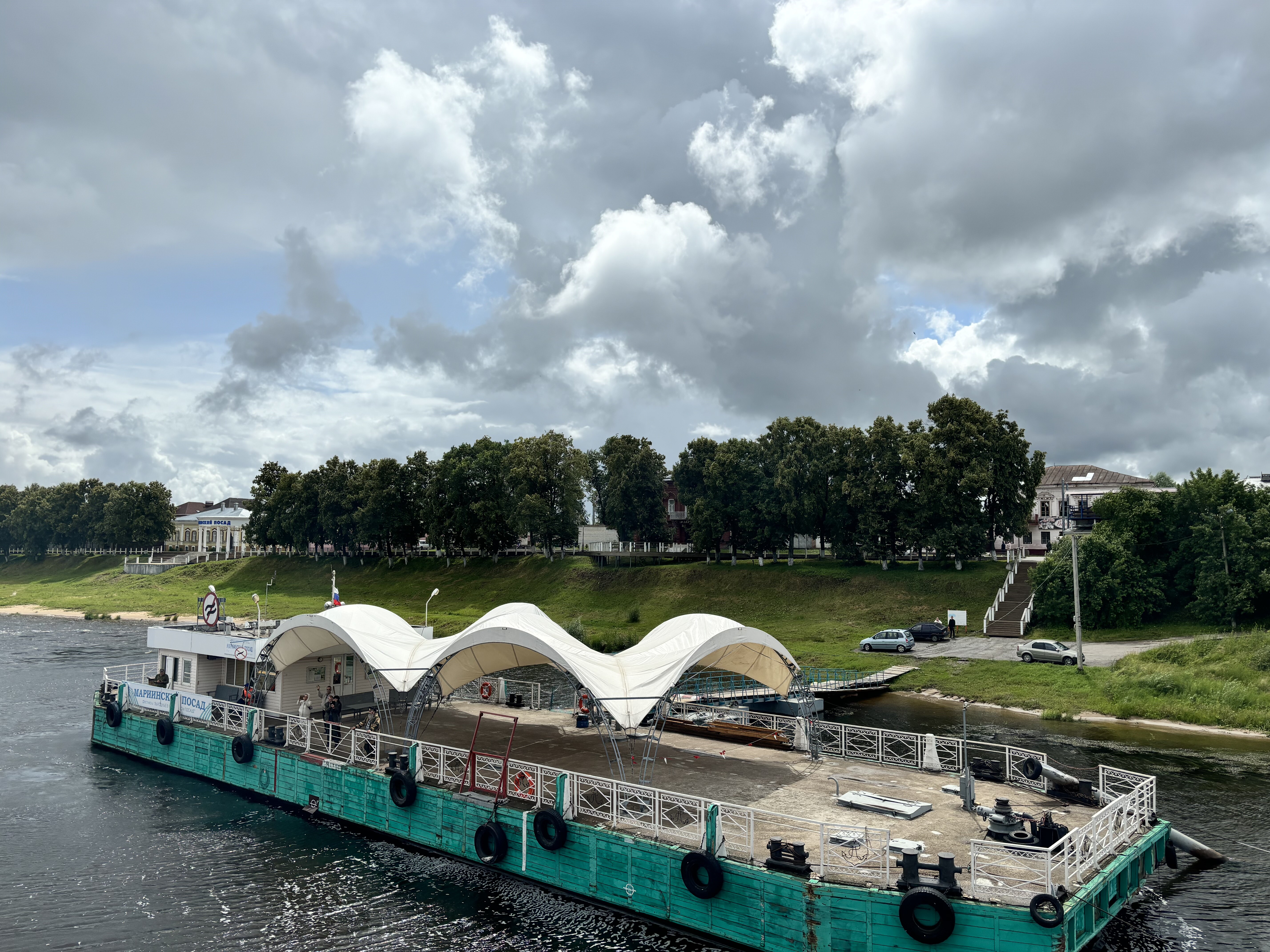 Гуляем мы гуляем и видим сгущающиеся тучи. Решаем выдвинуться по направлению к теплоходу от греха подальше) Только мы доходим до киоска Акконд на причале и разражается такой ливень, которых мы давно не видывали. Минут 20 прячемся вместе с остальными туристами внутри киоска и делаем кассу)))