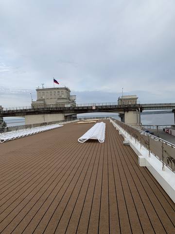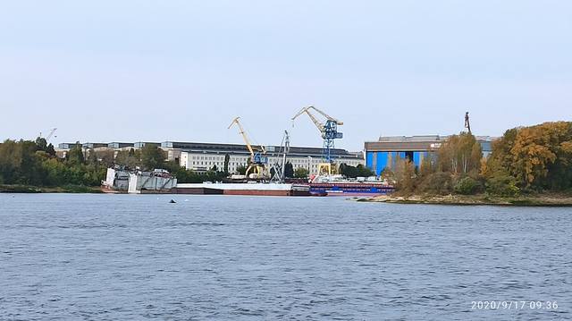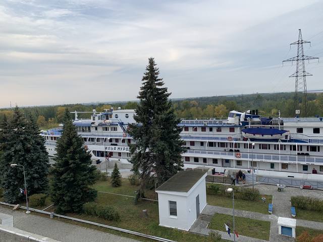 Видно очень плохо, но просматривается "Мустай Карим" в Галанино. Может будет лучше, когда "М.Булгаков" пройдет шлюзование, но в Галанино он не заходит, по расписанию. Скорее всего будет фото от ВВХ.
