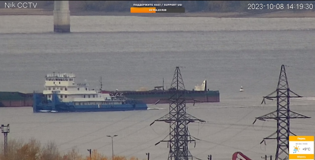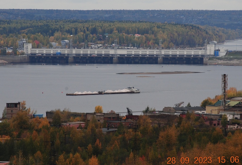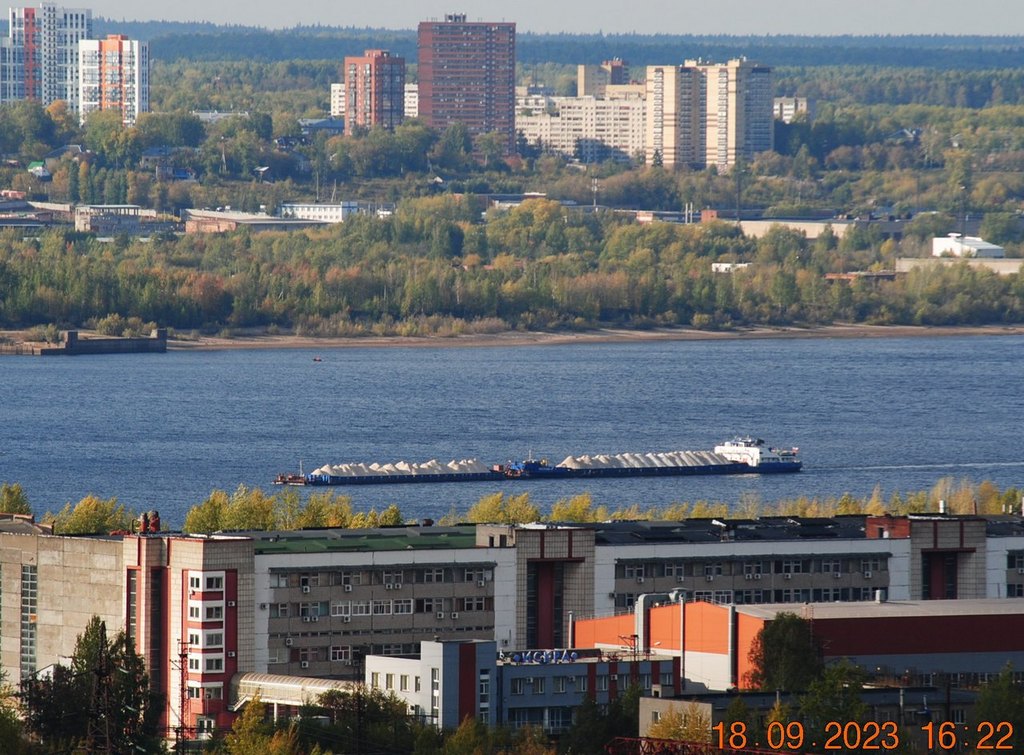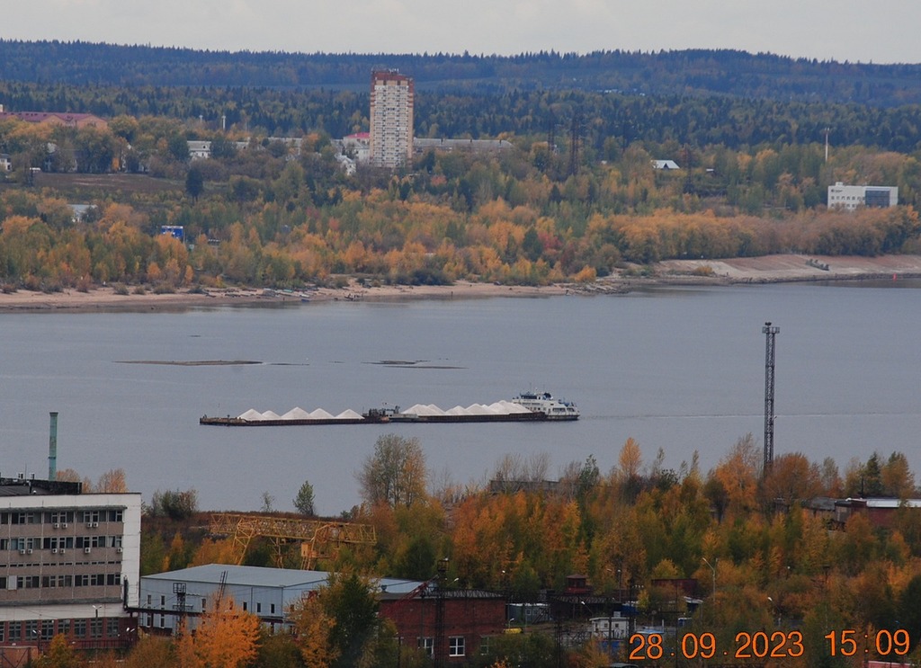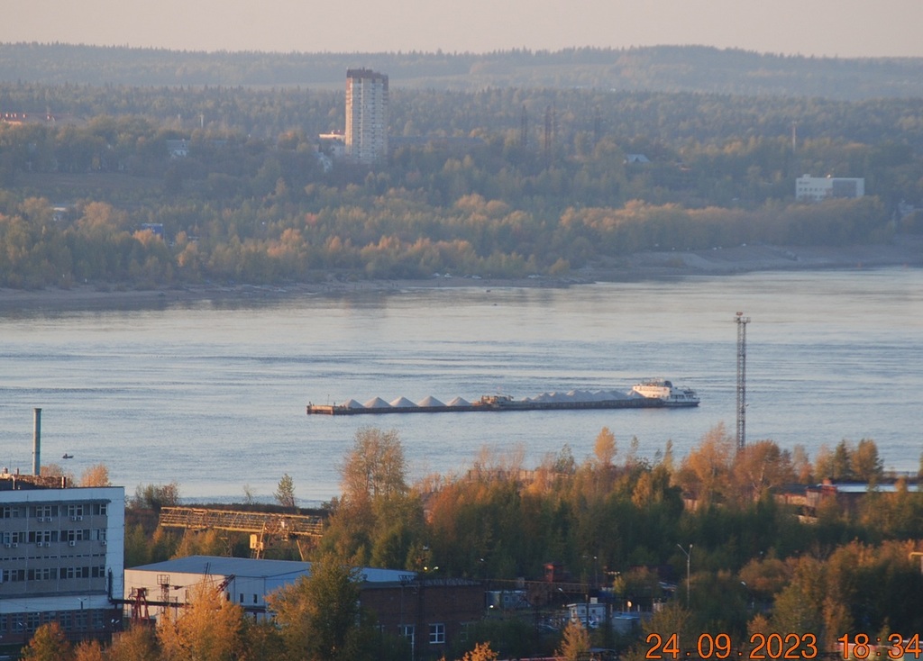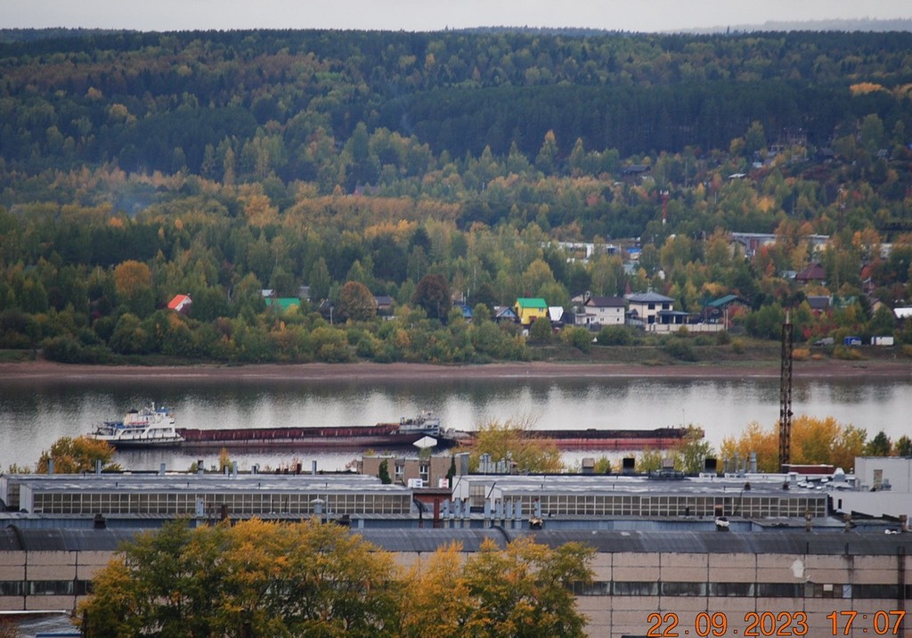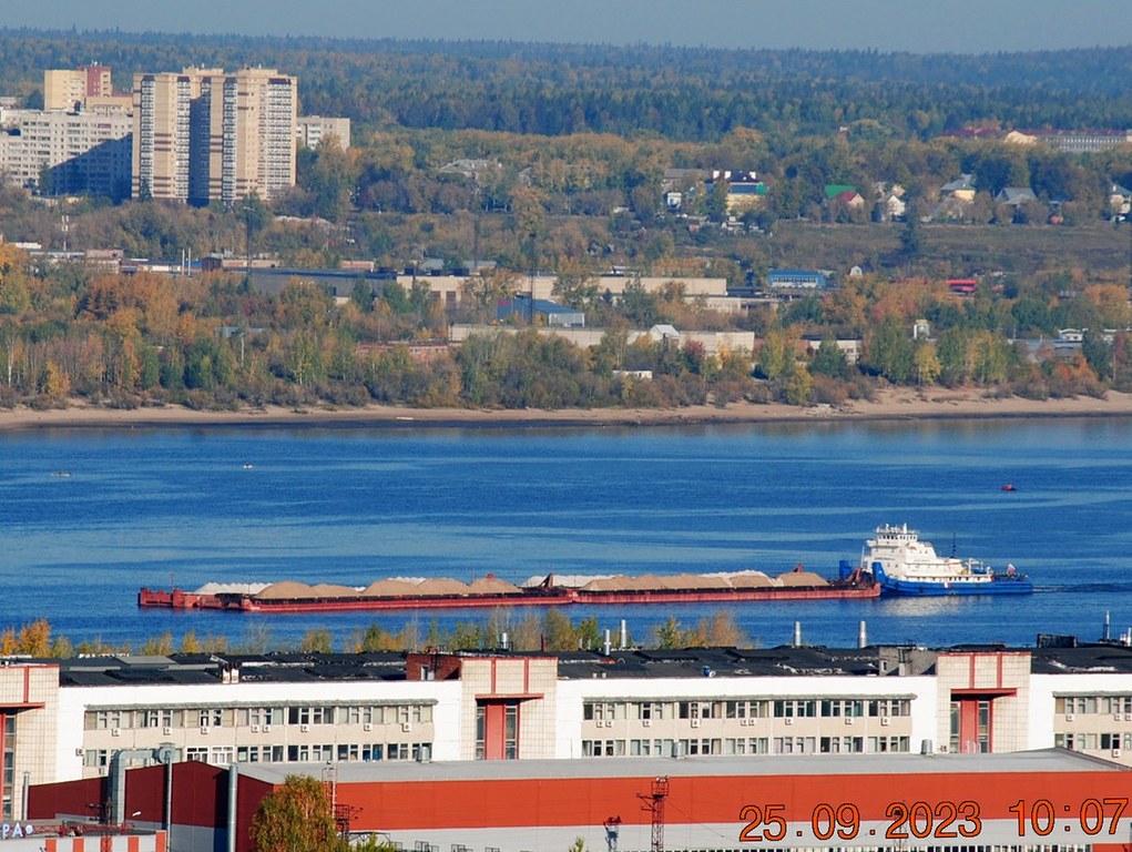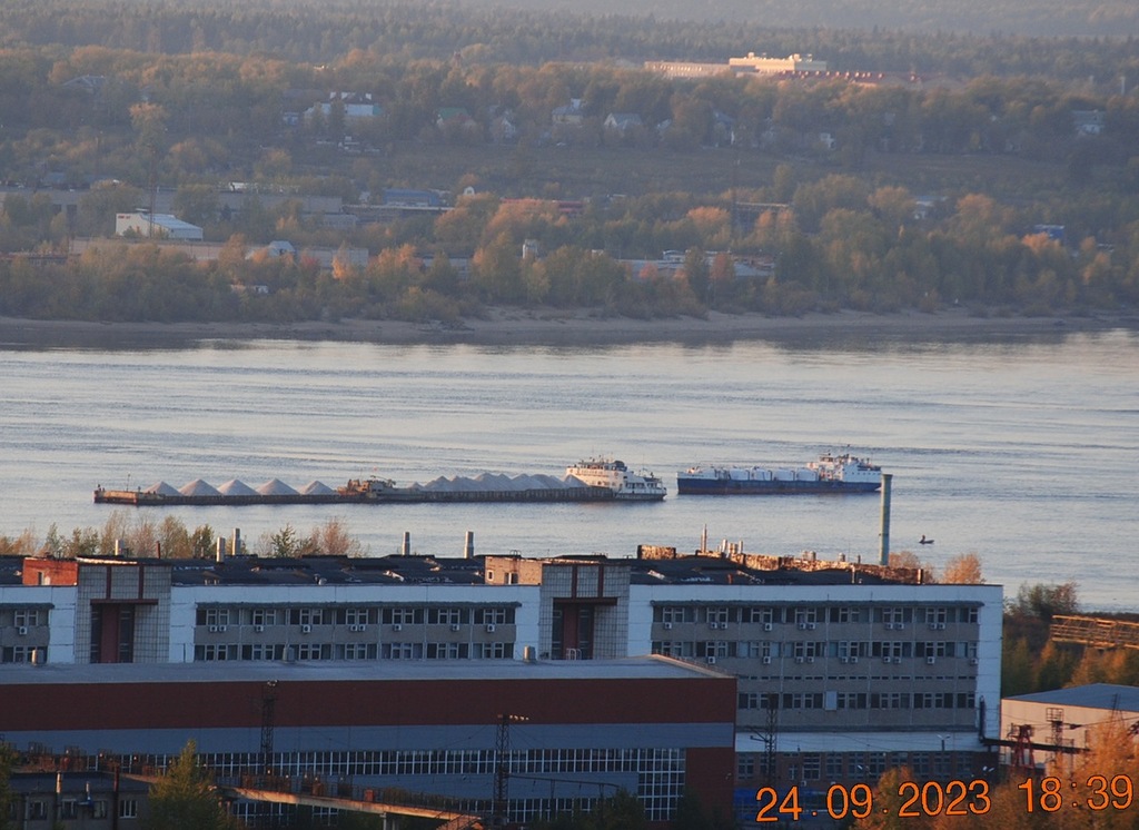 8 октября 2023 г - на рейде в Заостровке стоят: "Окский"-9 и парочка толкачей "Волгари"-24 и 29 с баржей "Белмакс"-9