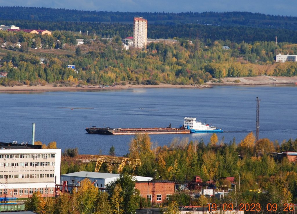 через 2,5 часа вниз проходит "Наташа" ( груз пиломатериал) идёт на выгрузку в Камбарку. Под боком ведёт плавкран №3326