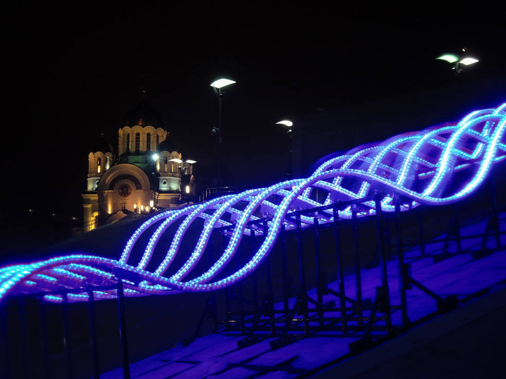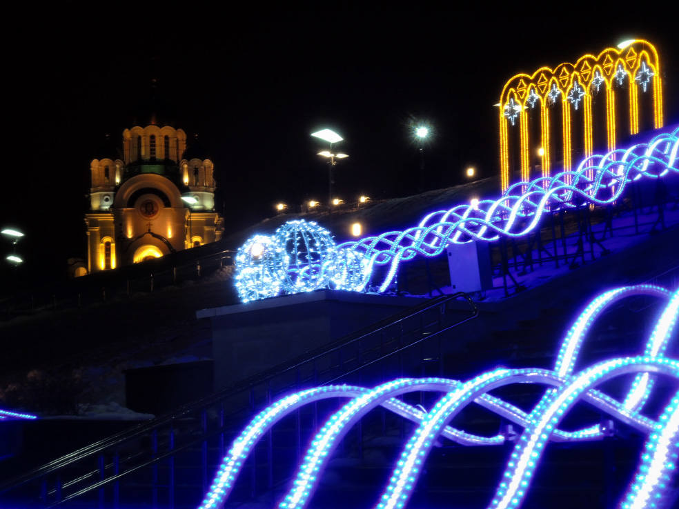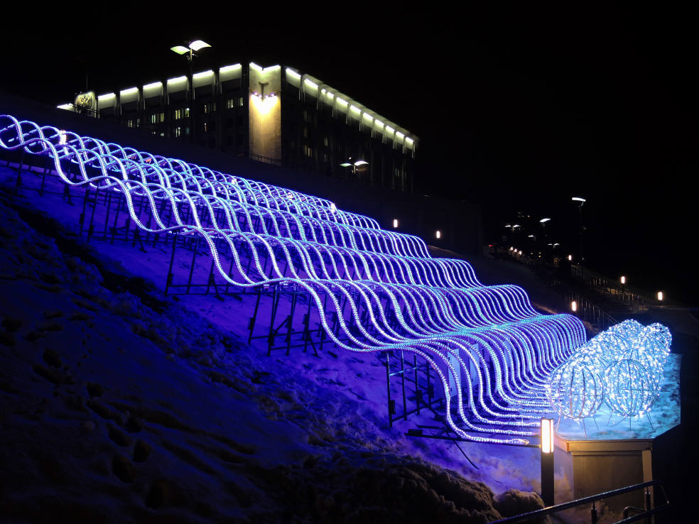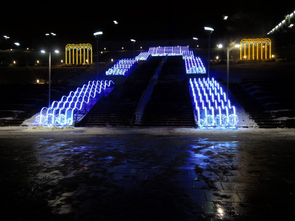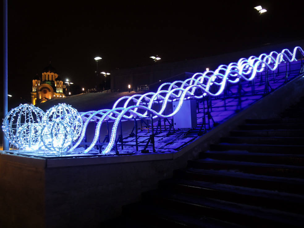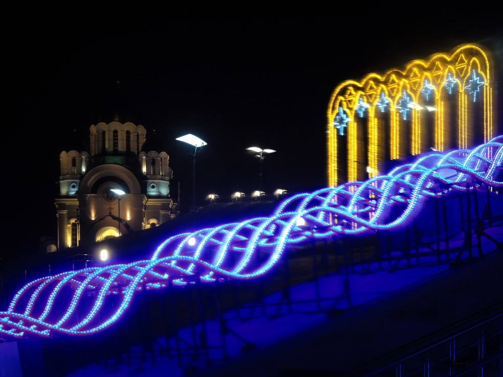Новинка этого года. В сети пишут, что это самый большой фонтан в Самаре. Приводятся какие-то страшные цифры по весу, длине и стоимости. Монтировали его долго. И вроде бы до сих пор не смонтировали полностью, какие-то части обещают подключить перед самым Новым годом. Плюс когда я доехал посмотреть на него, была жуткая погода. Периодически шёл мокрый снег, который залеплял объектив. В общем, получилось кое-как. Но уже как есть. Моё новогоднее вдохновение по Самаре закончилось на этом самом склоне в тот самый день.