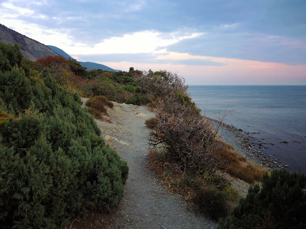 Я спросил у нашего гида, где здесь можно погулять самостоятельно. Он с большим энтузиазмом начал показывать возможные маршруты. Даже быстренько пробежался со мной чуть дальше. Главные направления здесь - мыс с причалом, маяком и дельфинарием. И прогулочная тропа, которая идёт вдоль берега в сторону Утришского заповедника. С неё тоже открывает красивый вид на мыс. А вокруг неё - заросли можжевельника.