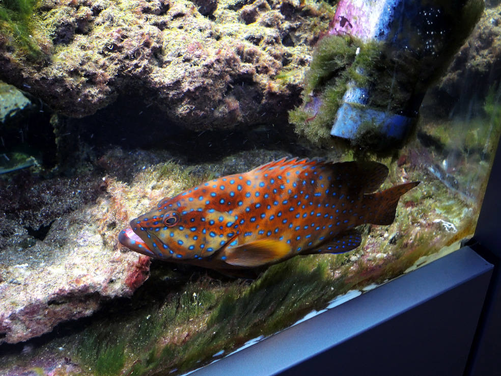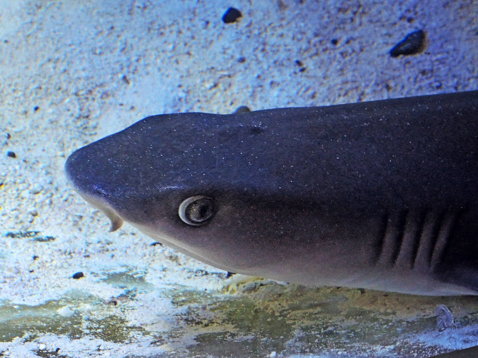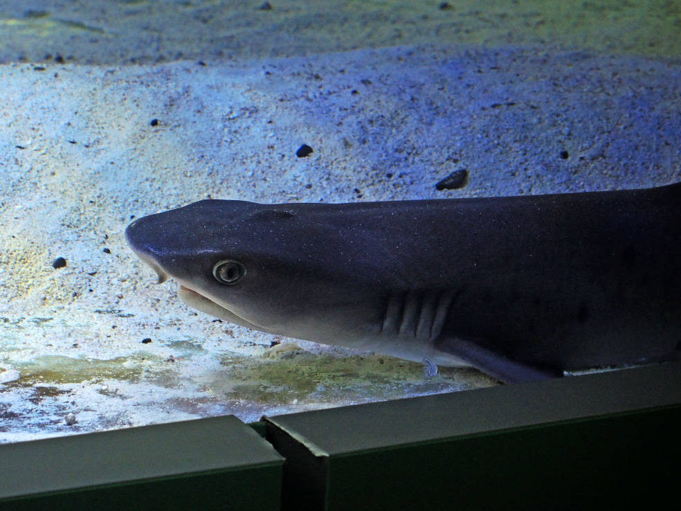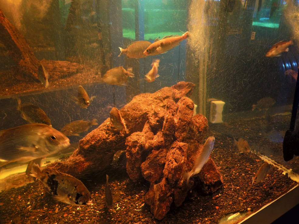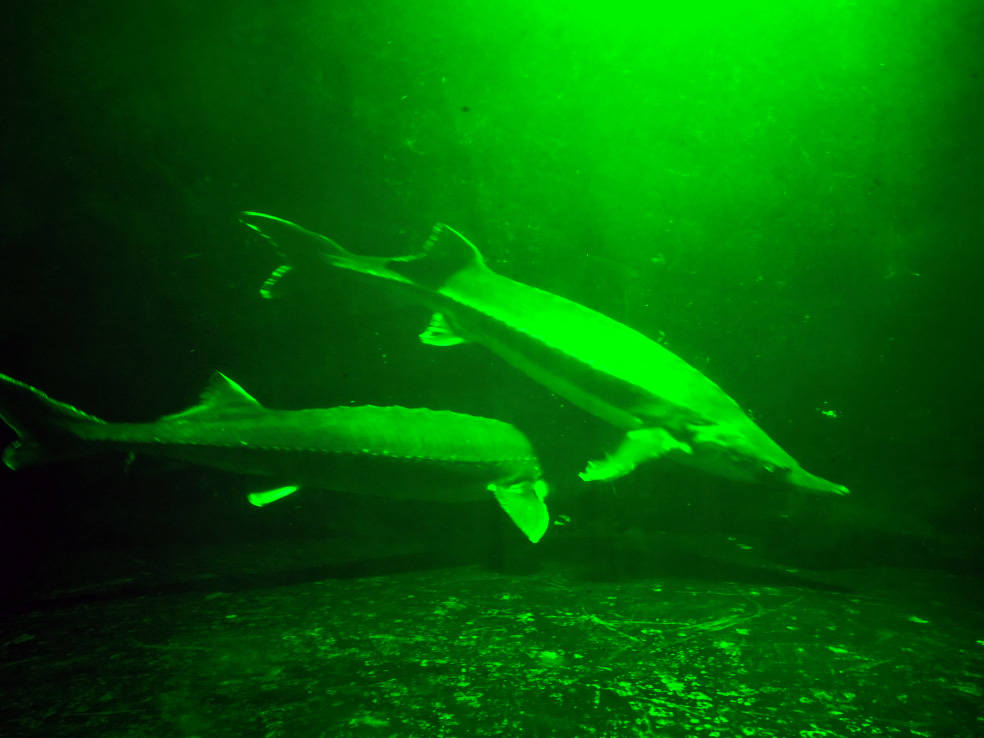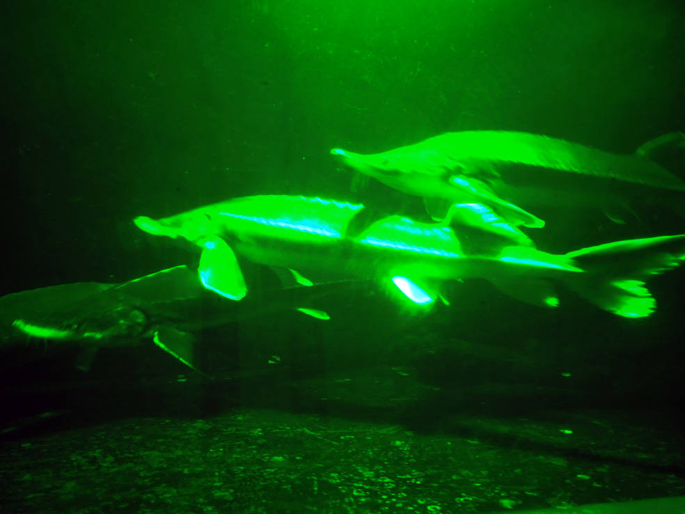 Итак, тоннельный аквариум. Здесь живут осетровые. И всё бы ничего, если бы не совершенно жуткая подсветка. На её фоне бесплатная фотосъёмка выглядит как откровенное издевательство. А уж насколько рыбам комфортно жить с таким светом, остаётся только догадываться.