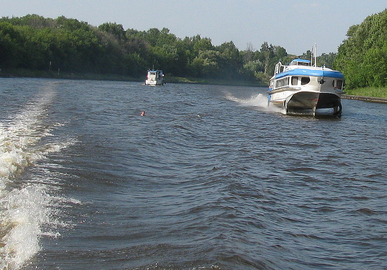 Где-то в теме про Ракеты (вроде ещё на ФРП) было старое фото 70-х годов с КиМа. Там в узком месте с крутыми берегами (видимо тоже где-то рядом) идет большой теплоход, а Ракета с ним расходится по левому борту, со стороны берега. И натурально несётся прямо через толпу купальщиков (головы в воде торчат и перед, и за Ракетой). Вот это экстрим. Представляете, сколько в советское время на КиМе Ракеты народу перерезали?! Когде Ракет были десятки (сам помню, как они друг за другом по 3-4 штуки шли), а купались на канале вообще тысячи человек (по Турциям и Египтам ведь ни кто не ездил - здесь и отдыхали).