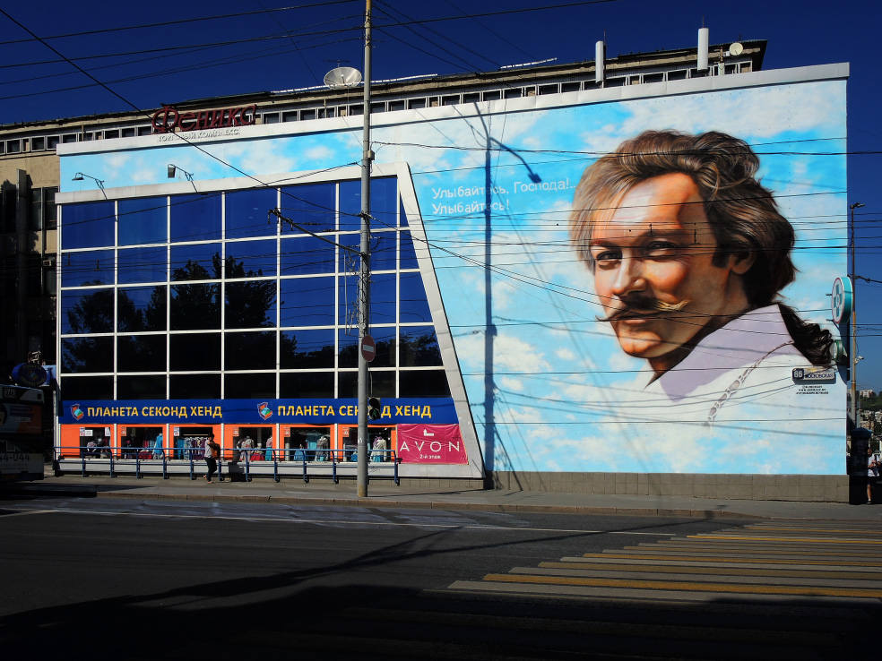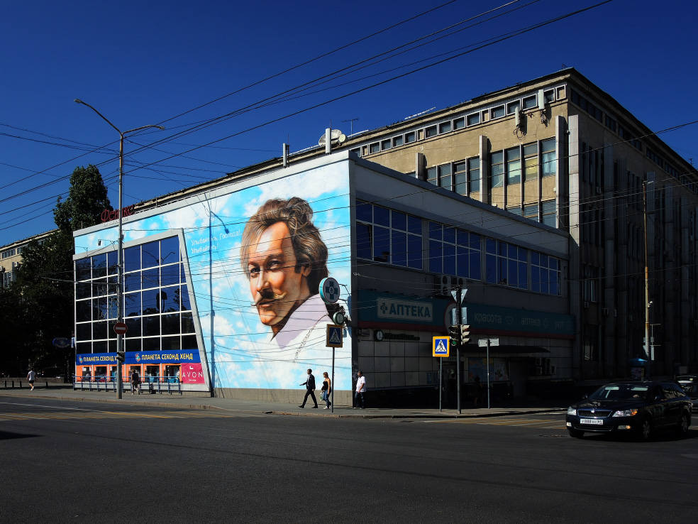 Выбраться с Соколовой горы решились на общественном транспорте. Во-первых, морально уже были готовы к штурму. Во-вторых, оттуда ехали в центр, а там я уже более-менее ориентируюсь. Доехали до Театральной площади. Здесь на углу улиц Московской и Радищева на фасаде здания летом этого года появился портрет Олега Янковского в роли барона Мюнхгаузена. Портрет получился очень живой. Но есть лёгкое ощущение неправильной перспективы.