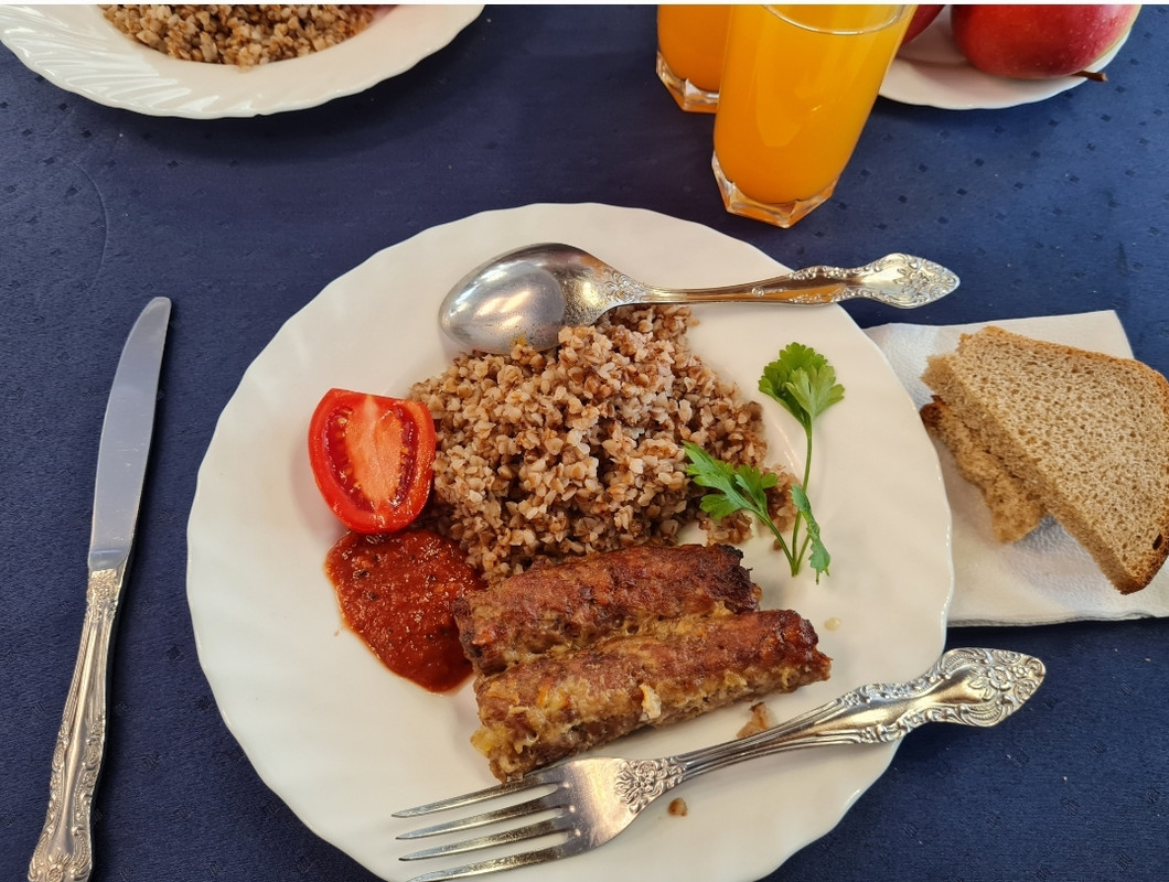 Кстате на обед была плотная солянка из копченностей на первое, гречка с "голубцами наоборот" (мясные сардельки фаршированые капустой), салат из квашеной капусты, помидора и перца.