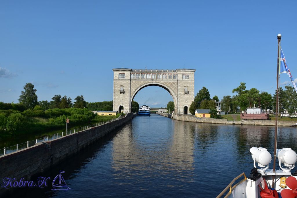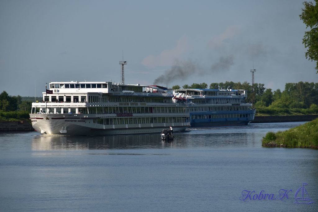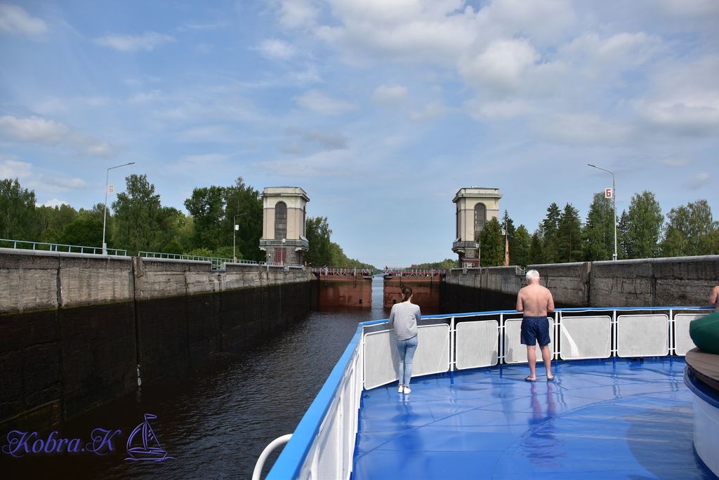 Отобедав, успеваем еще полчасика подавить ухо на подушке. И на одеяле. Выходим на борт, а тут уже Угличский шлюз. С выходящим из него Константином Коротковым.
