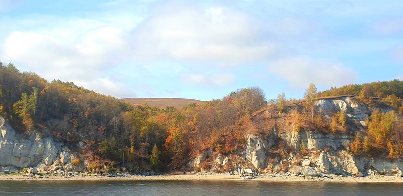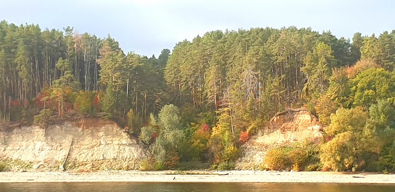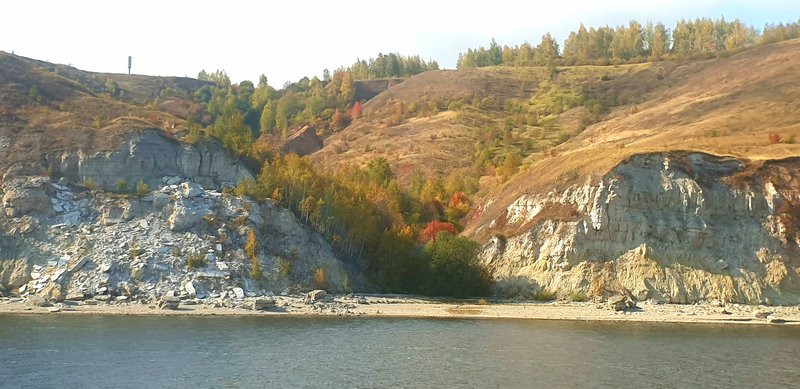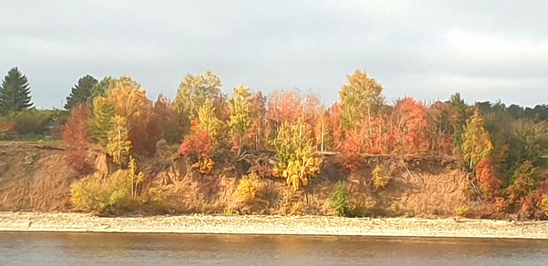 Какие берега!! Загляденье! Деревья разноцветные, небо голубое. В Куйбышевском водохранилище на встречу прошел Алдан.
