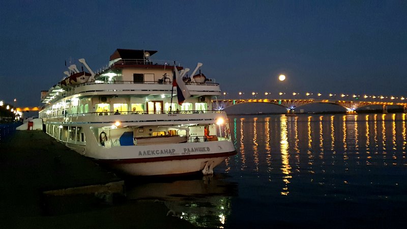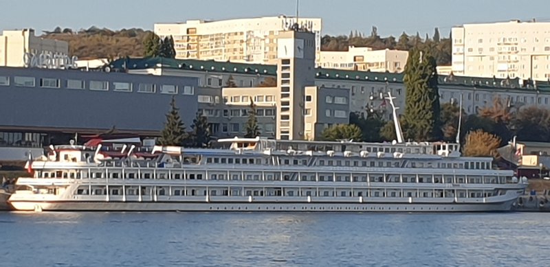 Сейчас сижу на пристани, жду рейсовый теплоход класса Москва. Круизный теплоход будет вечером.