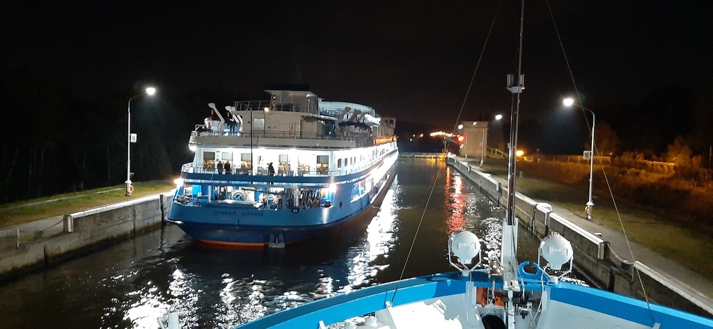 Ровно в 3 часа ночи, строго в ожидаемое время, мы разошлись с 1ой парой на Москву (2ая нитка шлюзования). Тихий Дон с Эдуардом и Анастасия. У обоих теплоходов заключительные рейсы навигации.