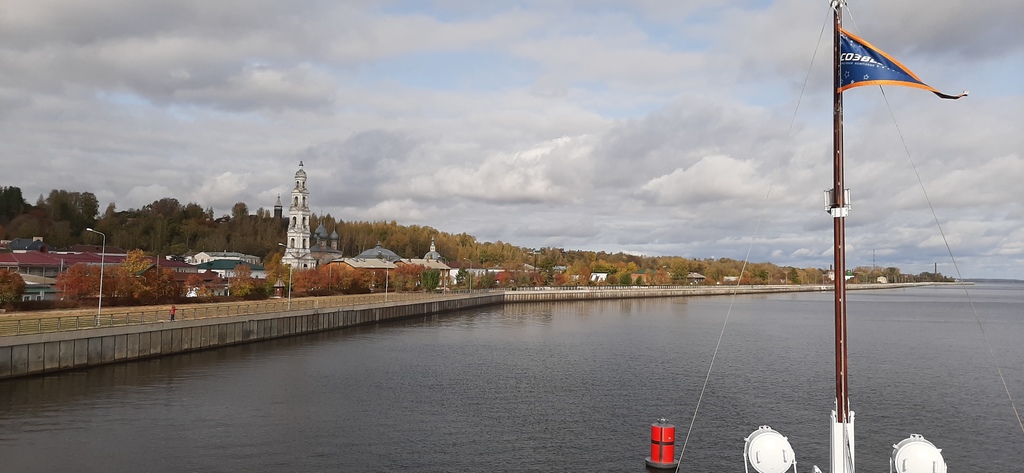 Поторопился немного. Дошли до разворотной точки. Что-то никак на закончат швартовку. А пора уже выходить. Никогда бы не подумал, что я мог выбрать экскурсию с музеем Тарковского. Но следов не осталось. Тарковский, так Тарковский. Главное, что на берегу опять Солнце пробивается.