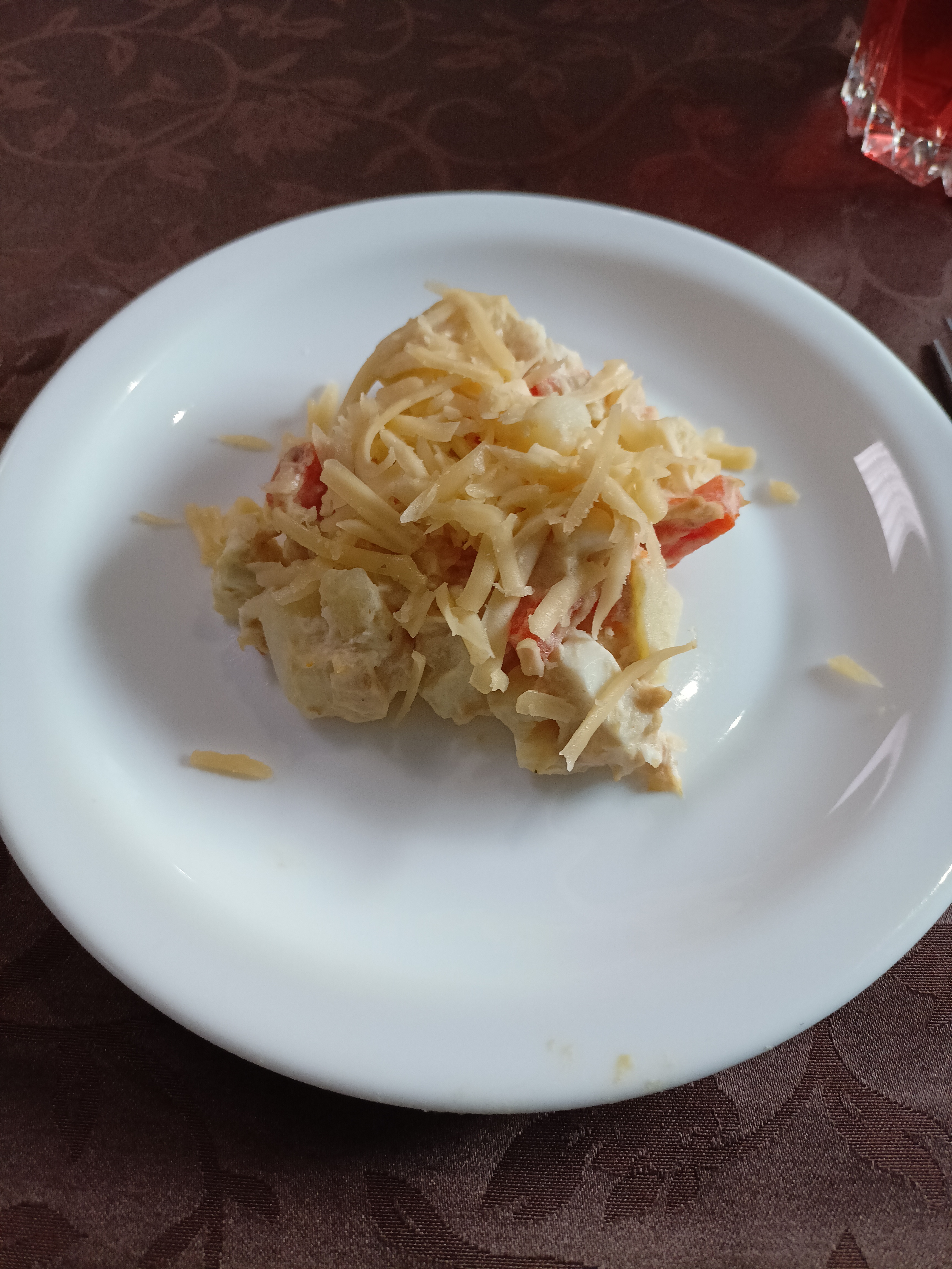 По сути - оливье без мяса под грубой сырной нарезкой.