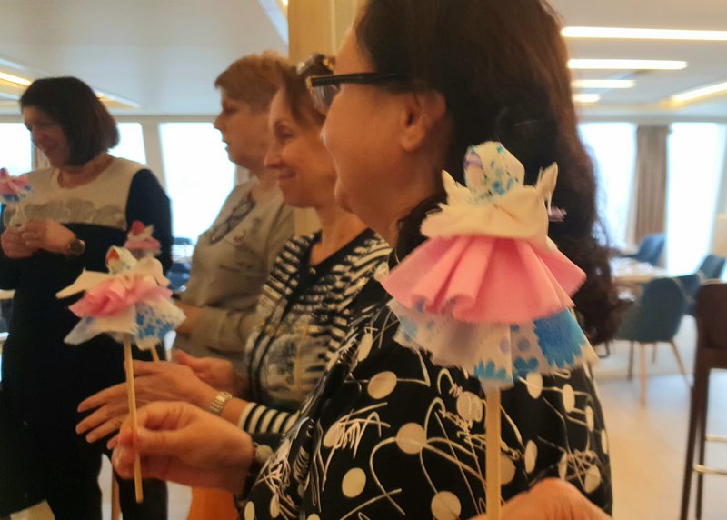 Ну а тем времегем на борту в формате нон стоп проходят различные мероприятия. Сходила на мастер класс по изготовлению куклы - колокольчик, послушали фортепьяно, началась игра в Словоманию, ну а мы ждем выступление скрипачки, уж очень она нам вчера на концерте понравилась. Да и очень приятно любоваться тем, что за бортом под музыку.